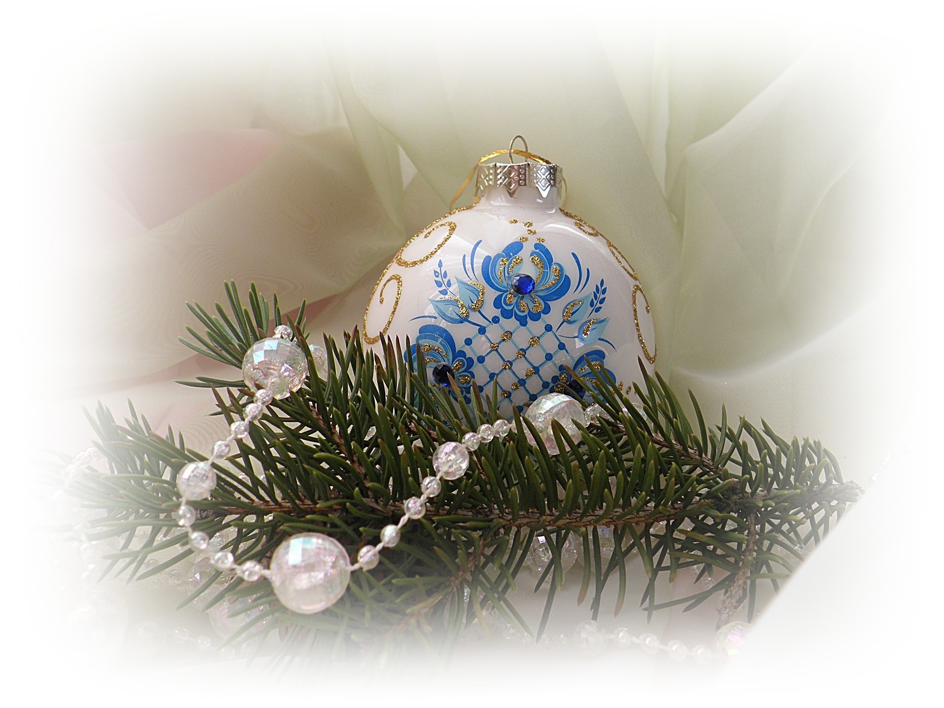 Un ramo di un albero di Natale e un giocattolo con un dipinto sotto Khokhloma