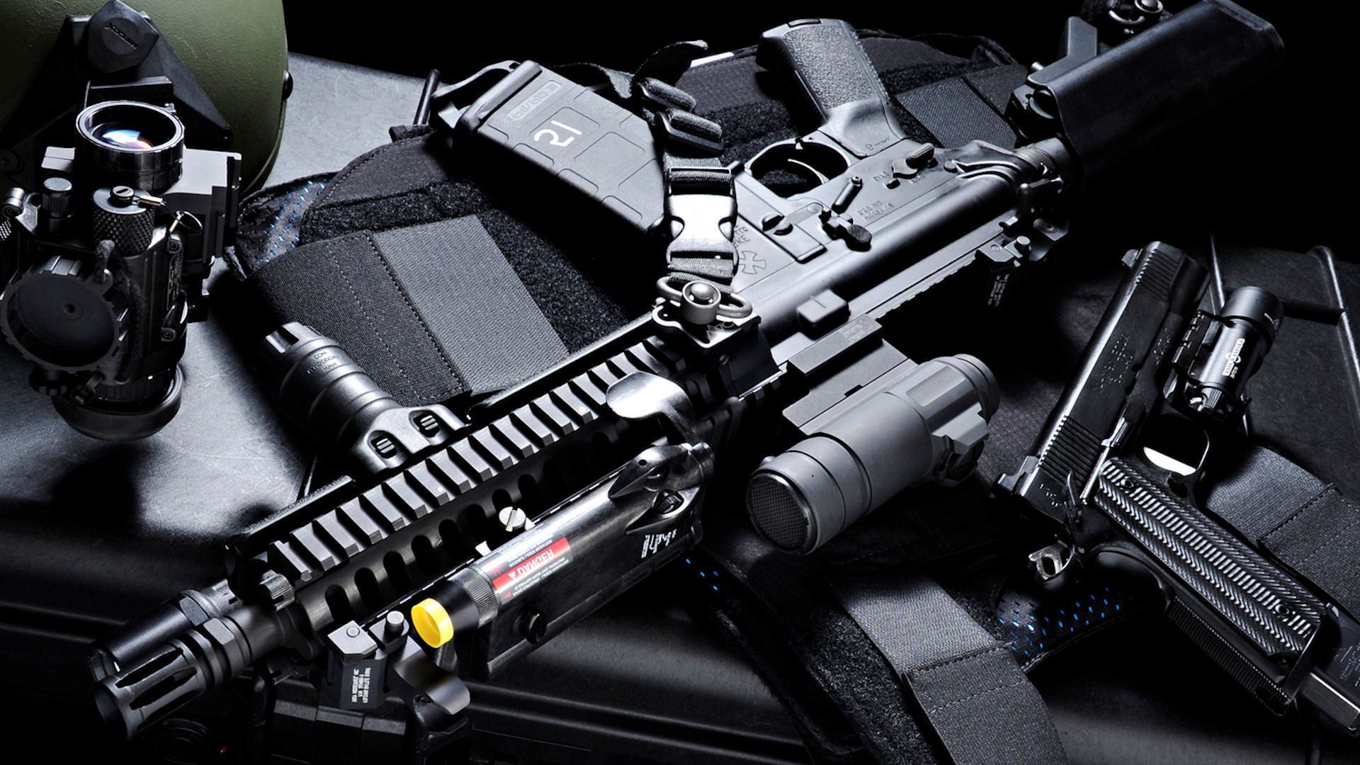 Pistola, fucile d'assalto, casco con dispositivo di Visione Notturna, sdraiato sul giubbotto antiproiettile