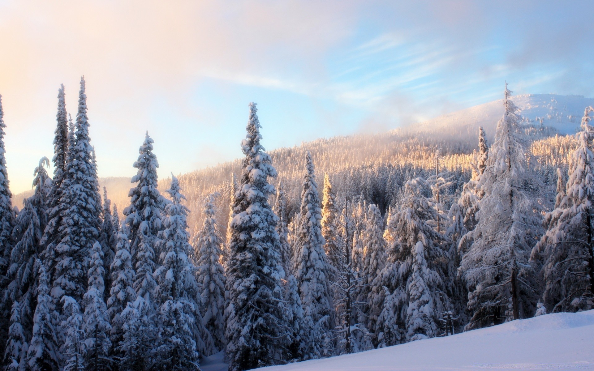Strada nella foresta fredda invernale tra gli alberi di Natale