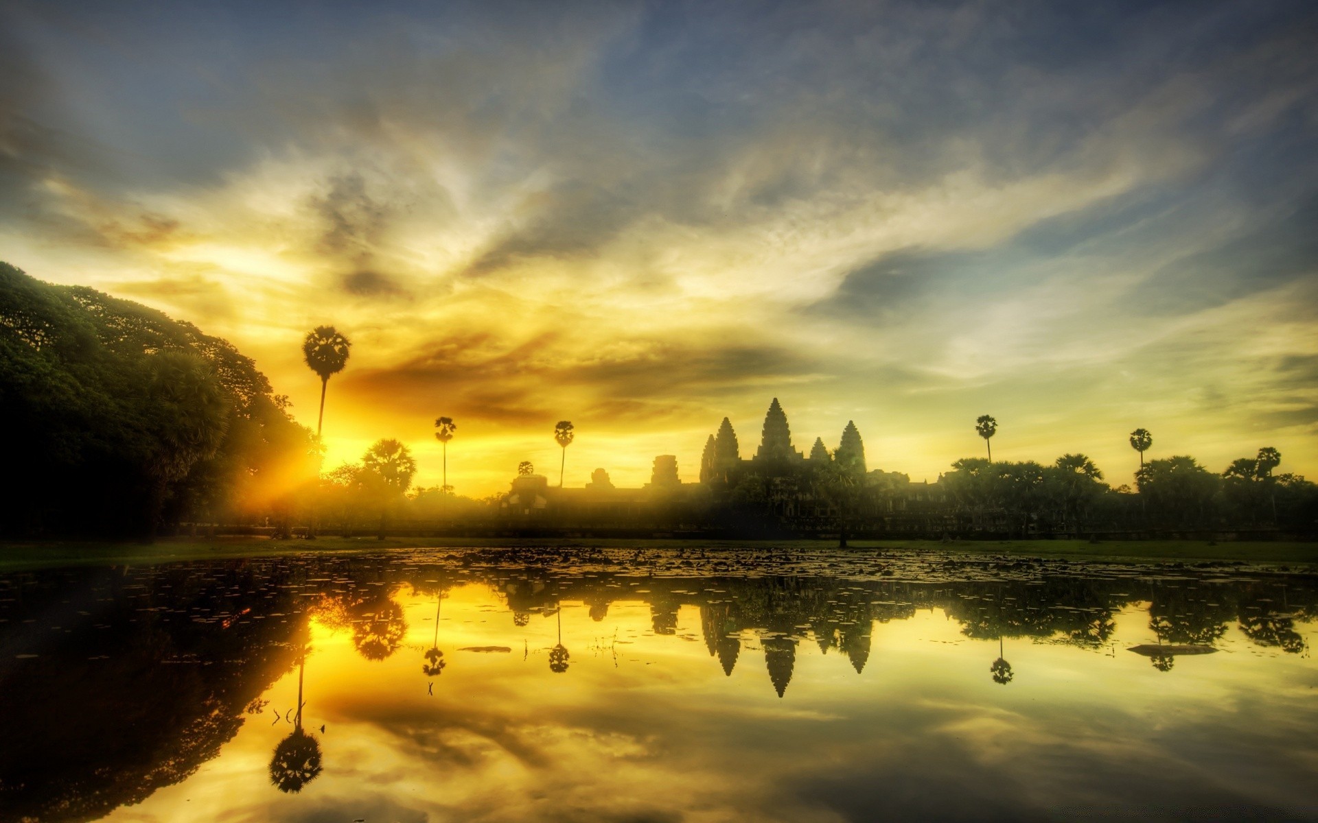 Il cielo nuvoloso della sera si riflette nell'acqua