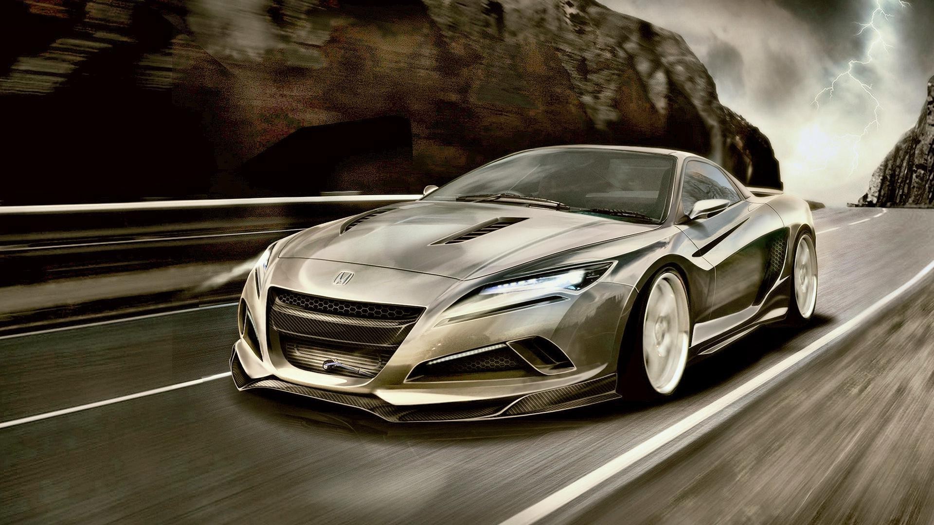 Un'auto scarlatta brillante lucidata su uno sfondo di cemento grigio