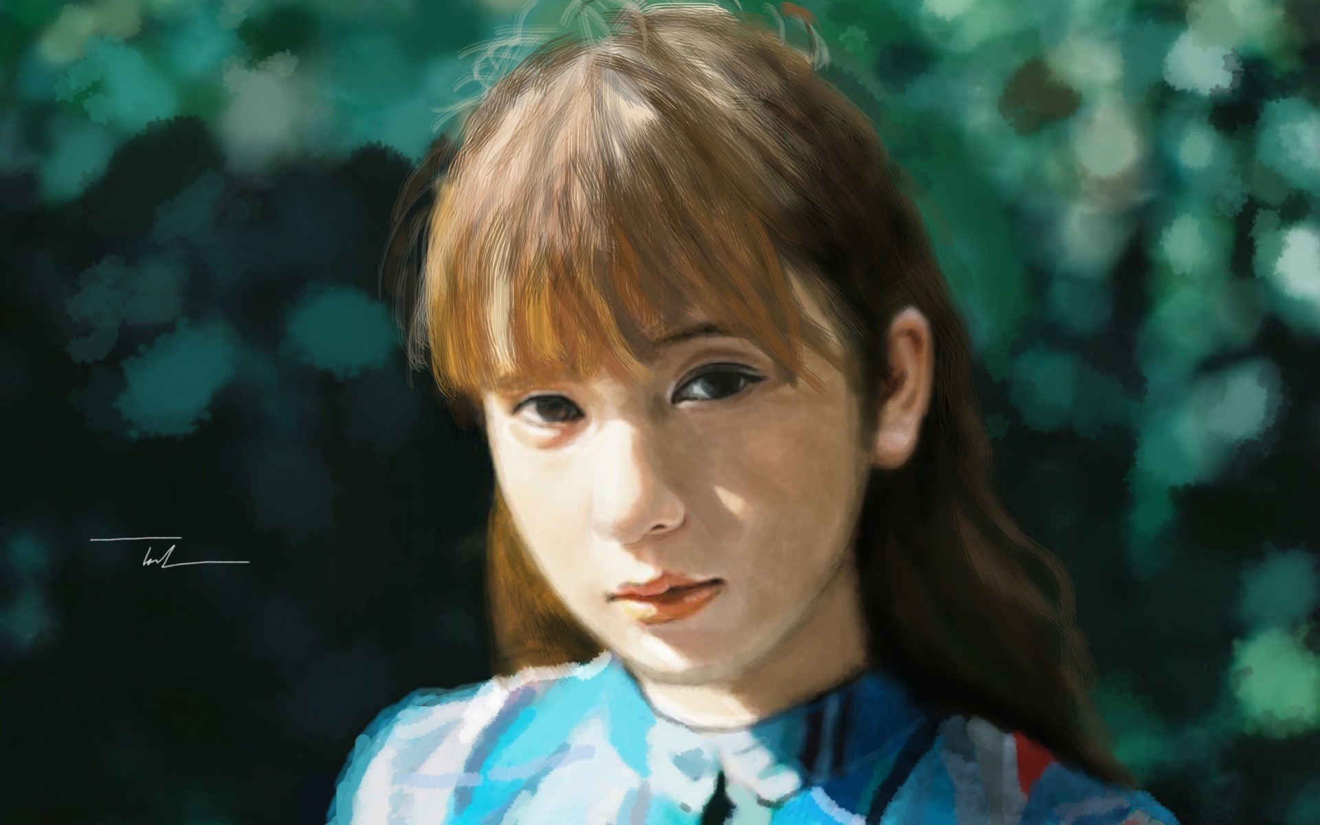 Disegno ritratto di bambina su sfondo verde scuro soleggiato