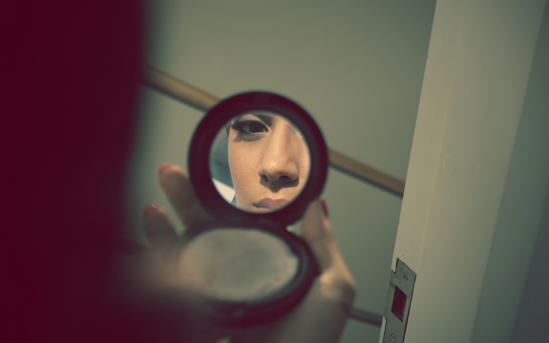 Foto di riflessione di una donna in uno specchio tascabile