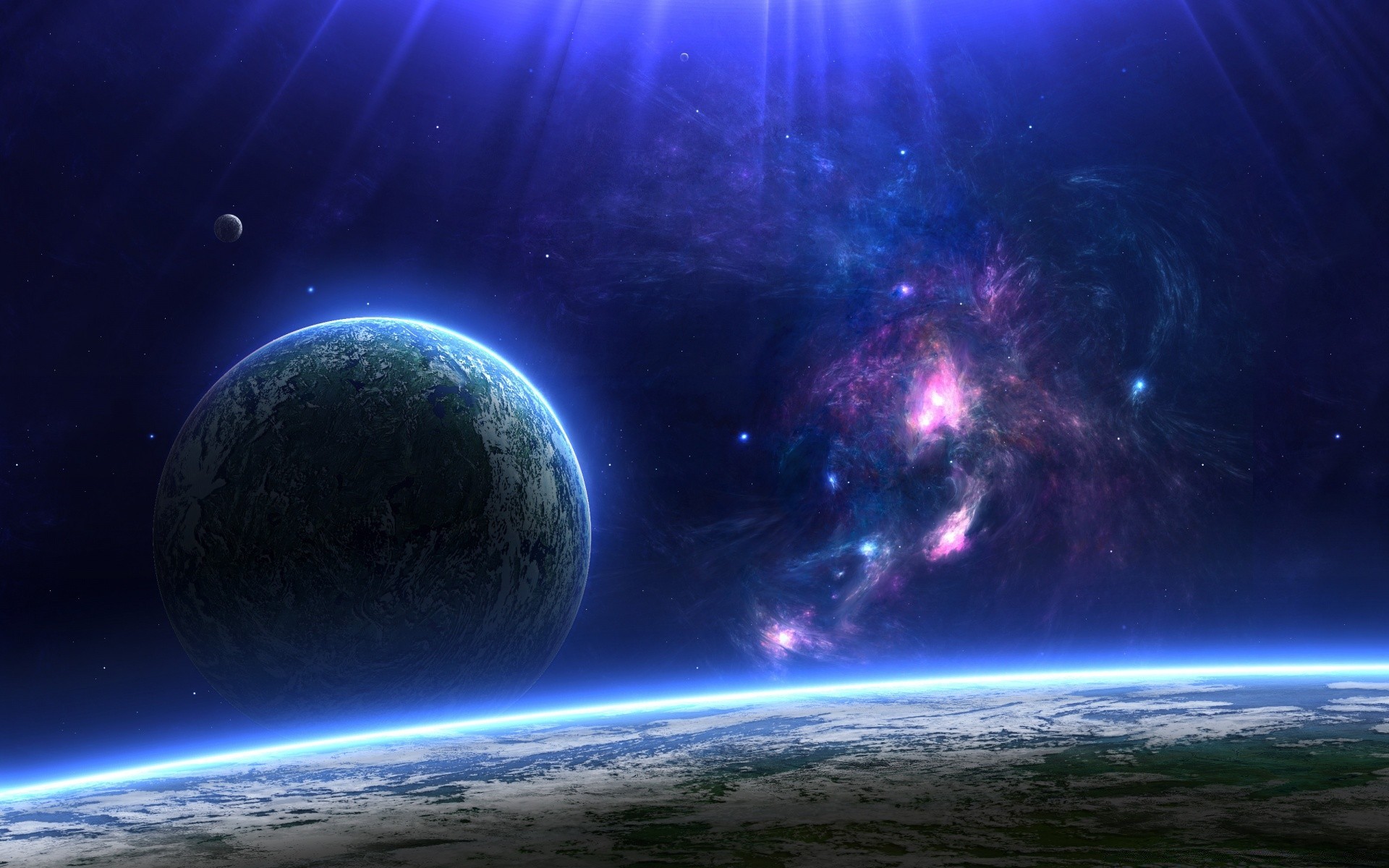 Vista dallo spazio di un pianeta con un'Alba blu