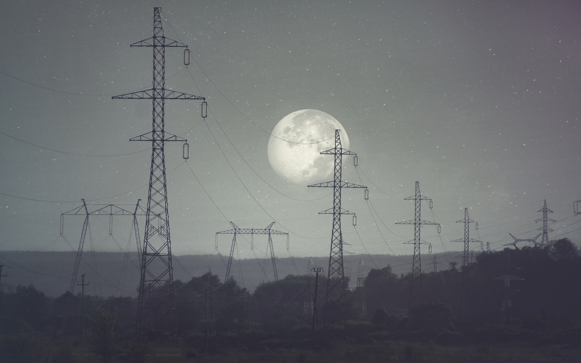 Pilastri che conducono corrente sullo sfondo della Grande Luna