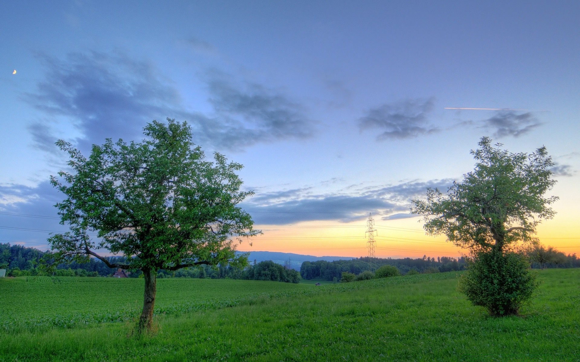Paesaggio. Cielo blu. Nuvole nel cielo. Albero verde. Erba verde