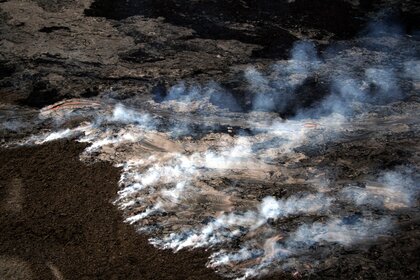 Eruzione vulcanica sullo sfondo di oceano e rocce