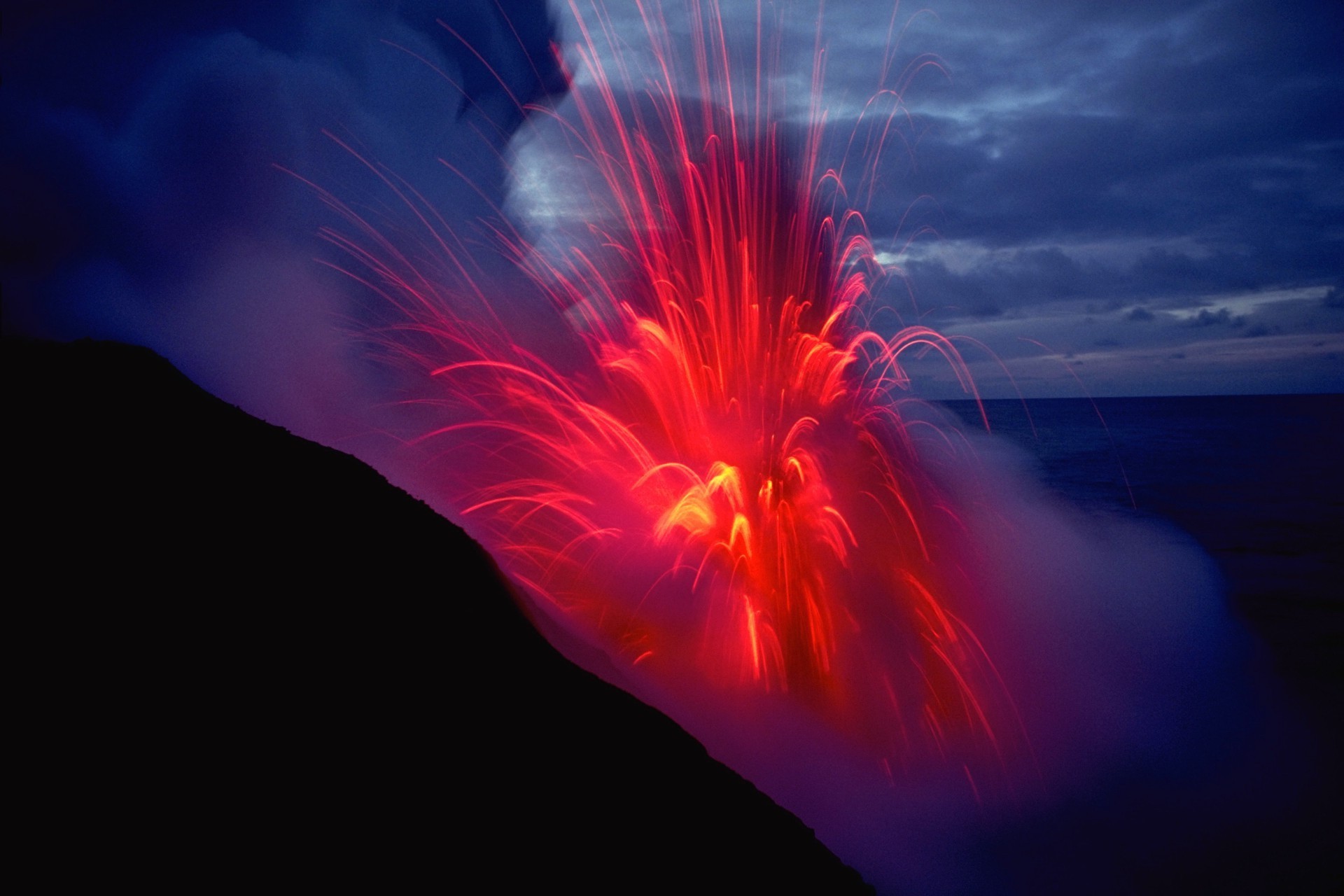 Uomo e ragazza sullo sfondo di un'eruzione vulcanica