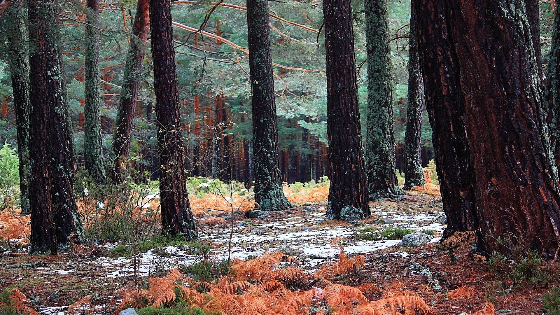 Paesaggio invernale, terreno montuoso e foresta di conifere