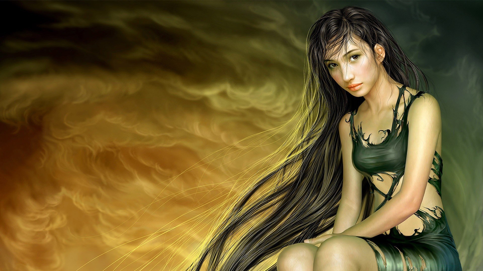 Bruna dai capelli lunghi su uno sfondo di cielo infuria