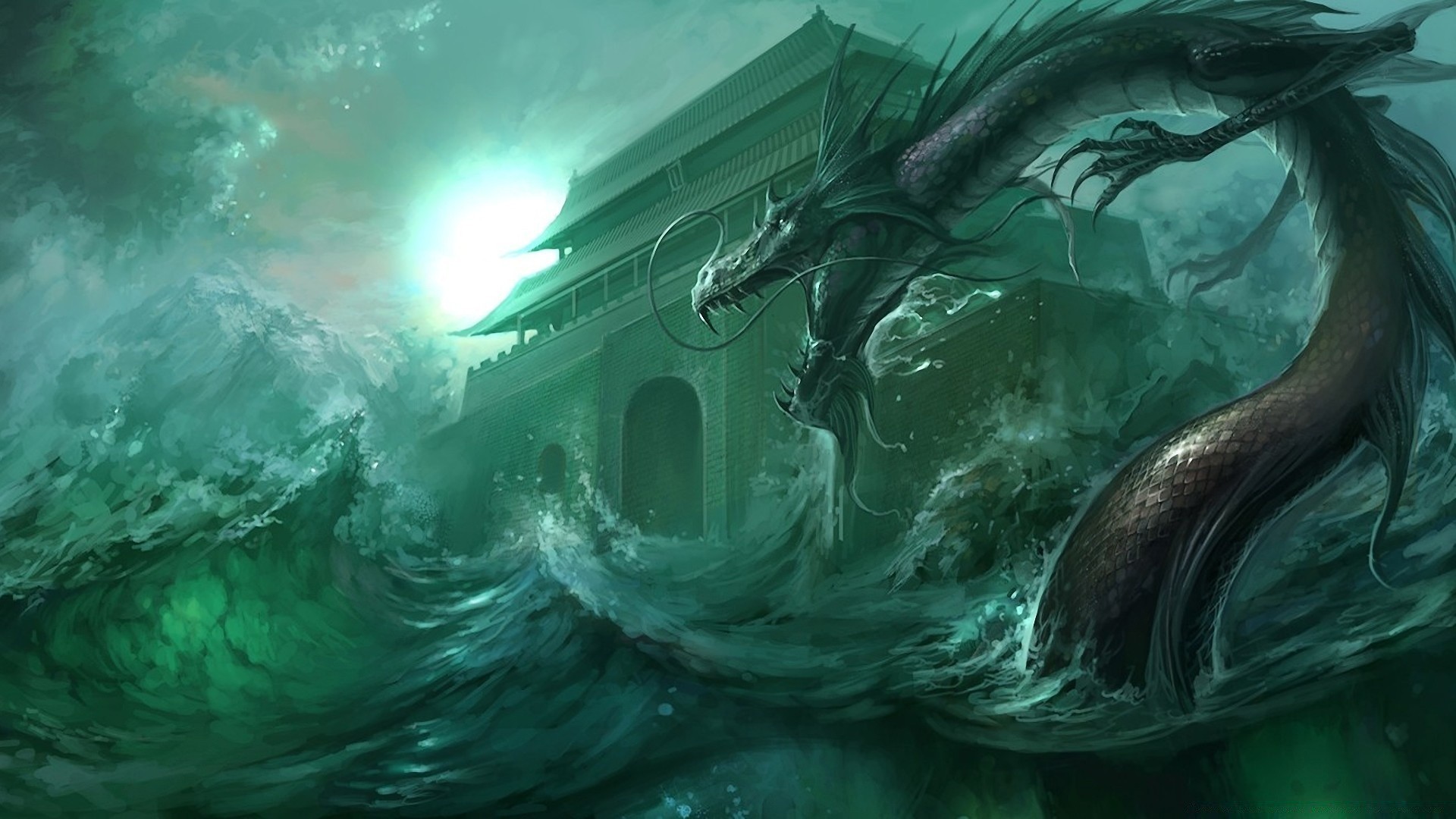 Misterioso mondo sottomarino con un drago fuori dall'acqua