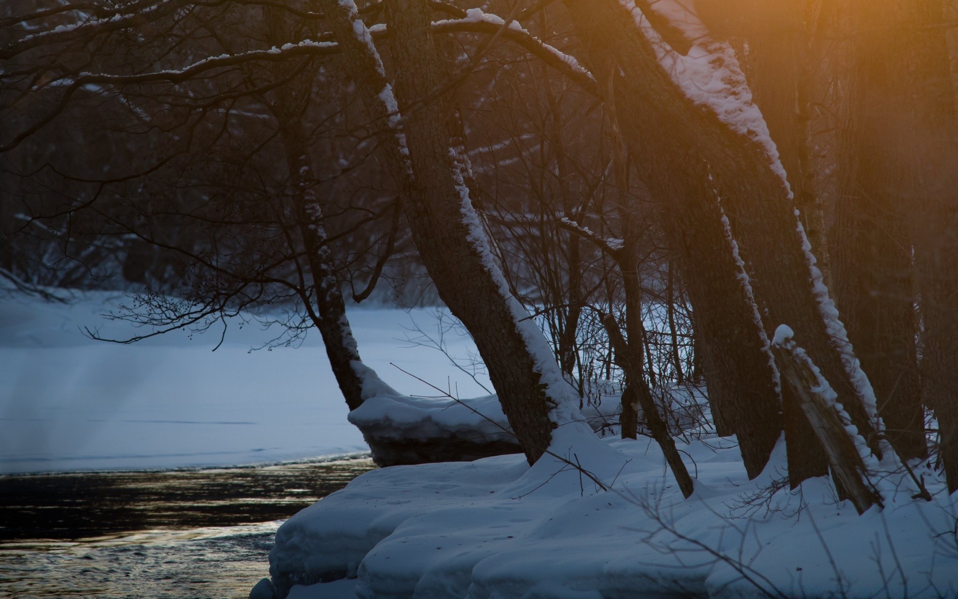 Vista dei tronchi d'albero vicino al torrente in invernoVista dei tronchi d'albero vicino al torrente in inverno