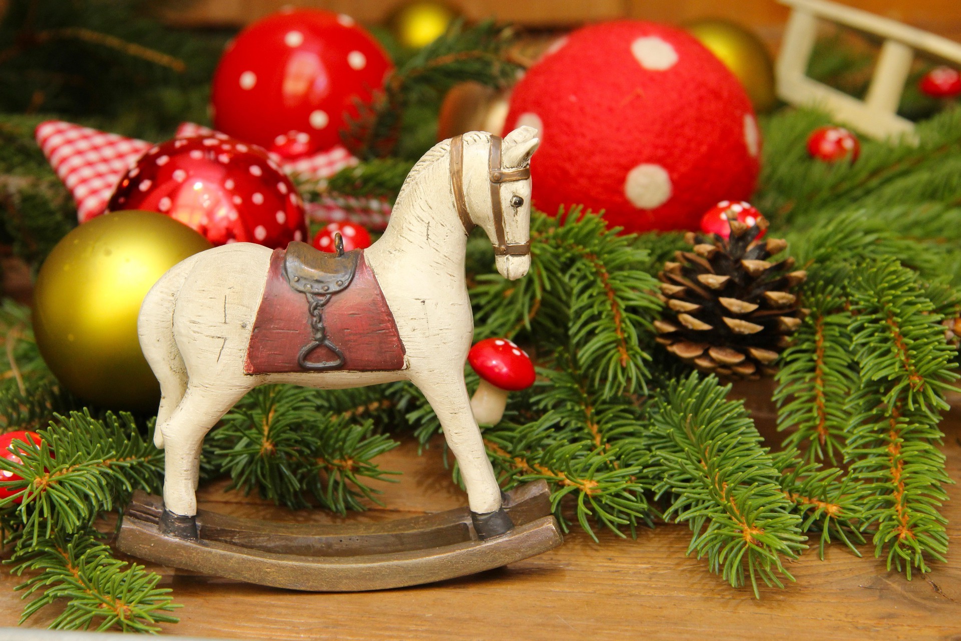 Cavallo di legno su uno sfondo di giocattoli di Natale