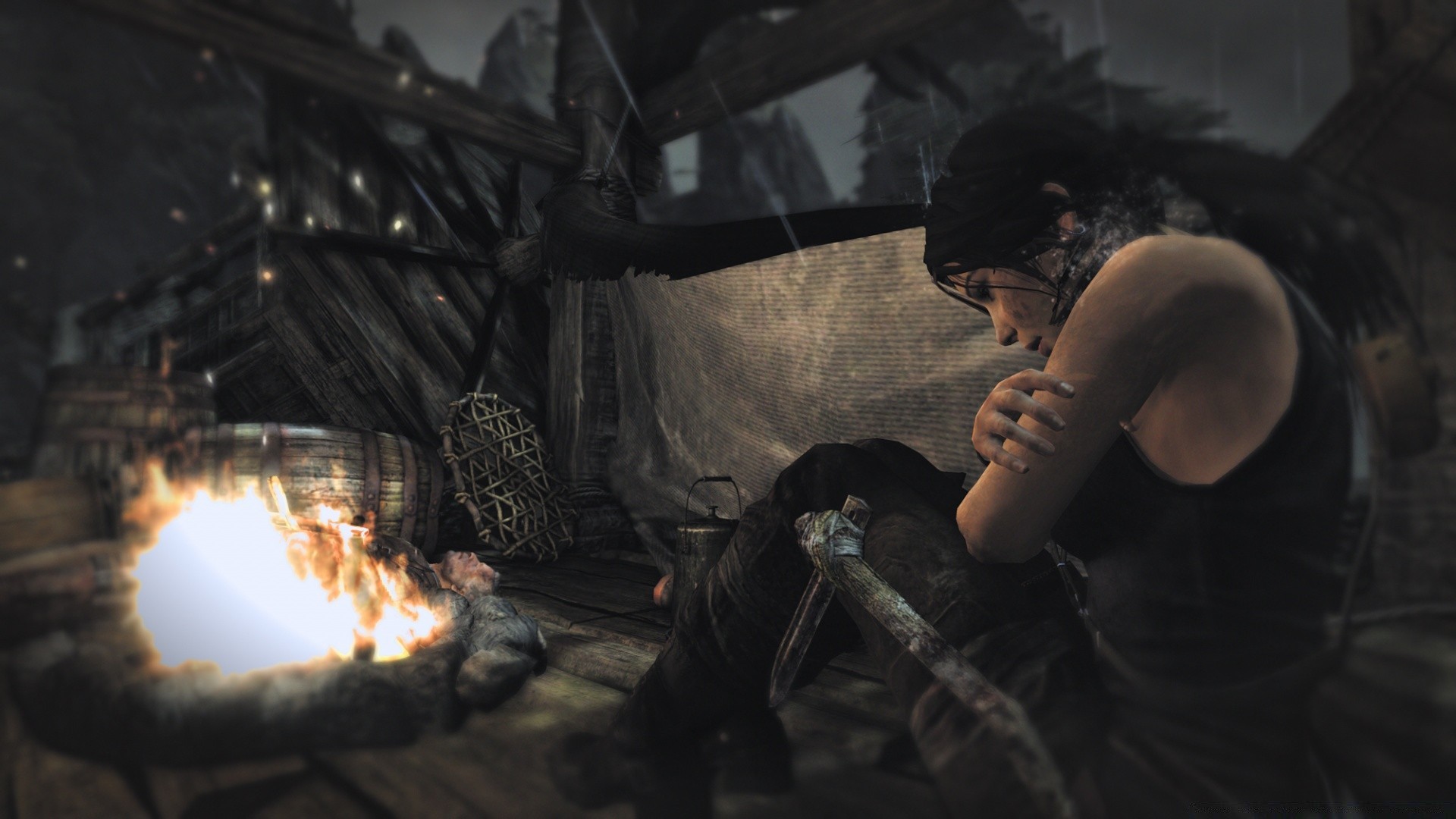 Lara Croft in un falò in una grotta