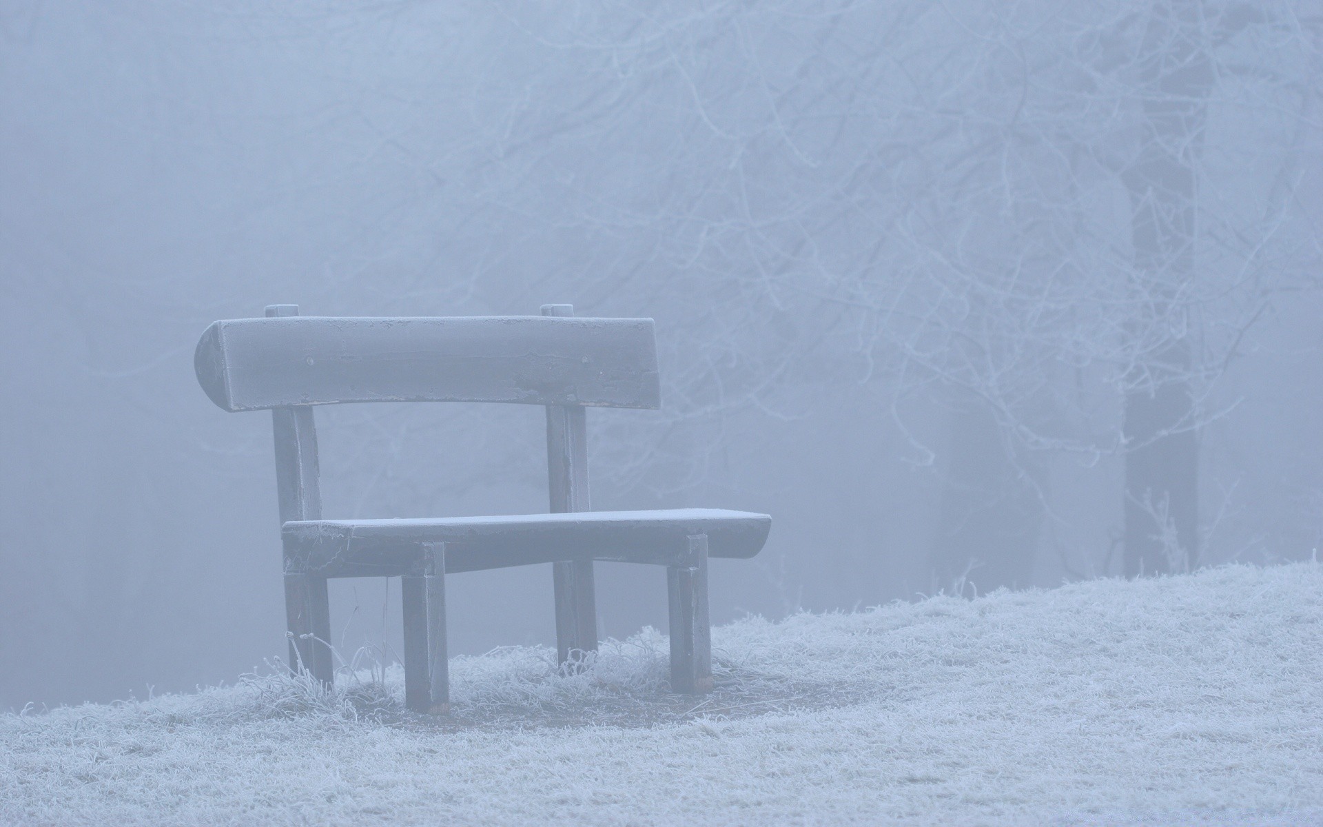Panchina nella nebbia spruzzato con la neve