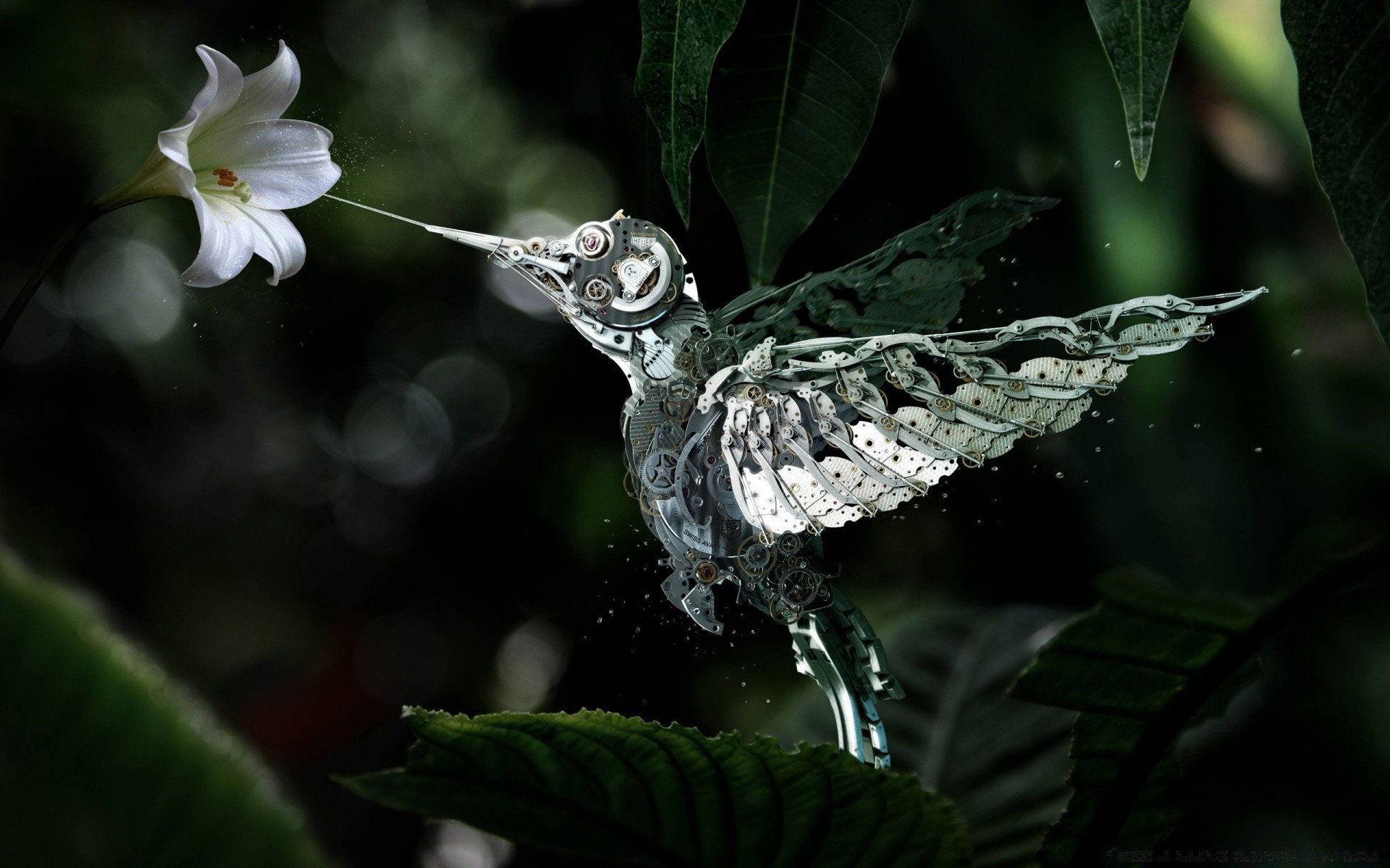 L'uccello di cristallo inala il profumo del fiore