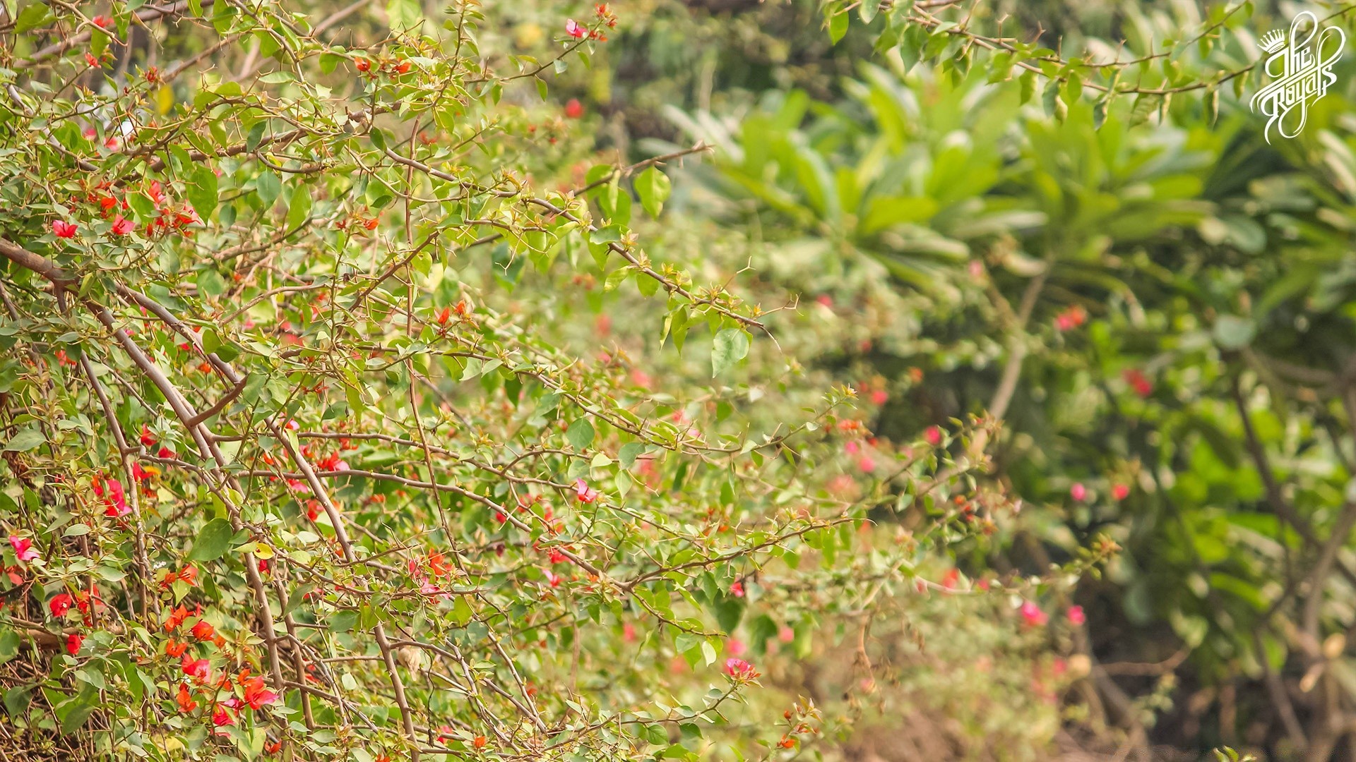 Riflessione di fiori in goccioline di rugiada su una foglia