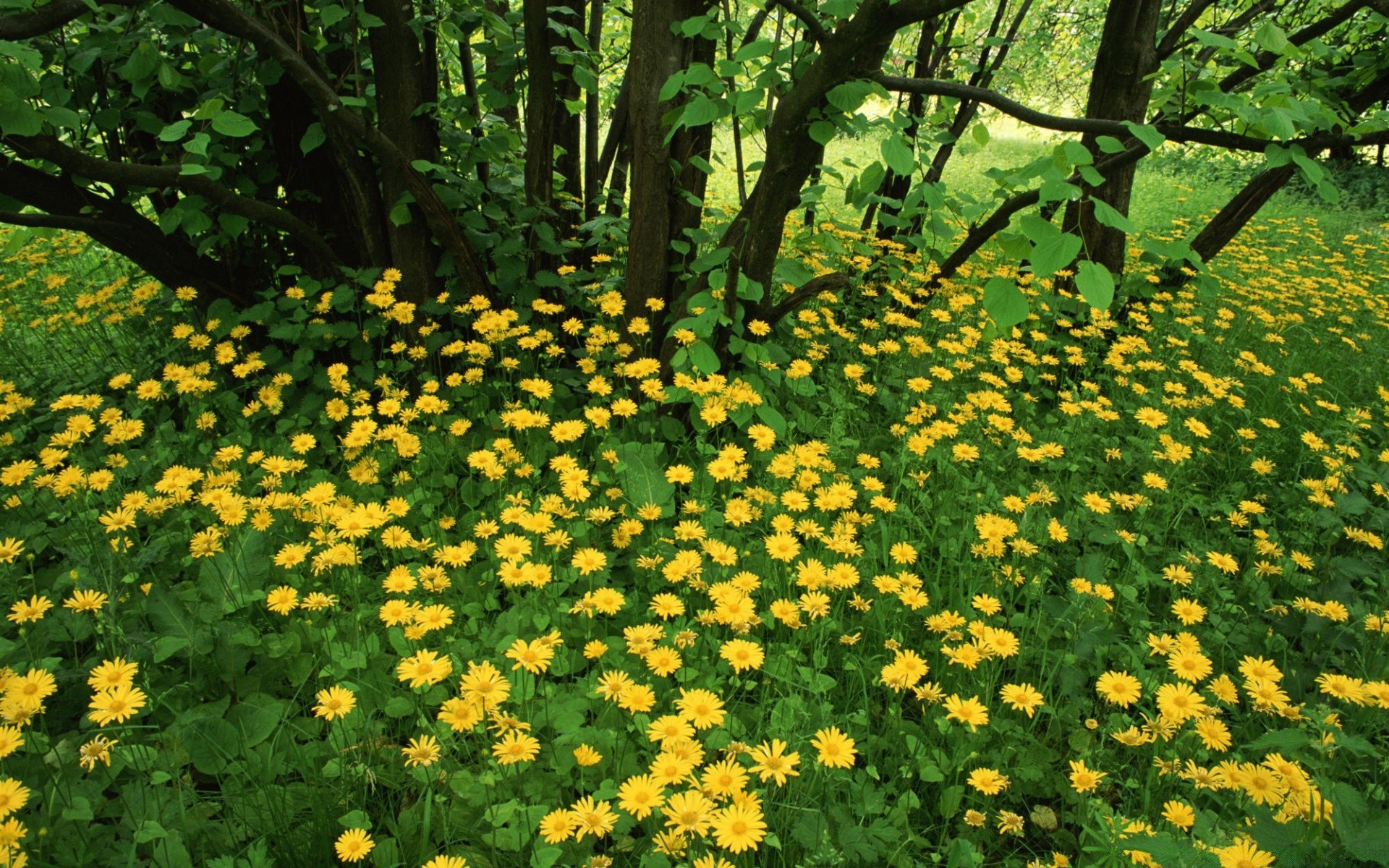 Radura di fiori gialli nella foresta
