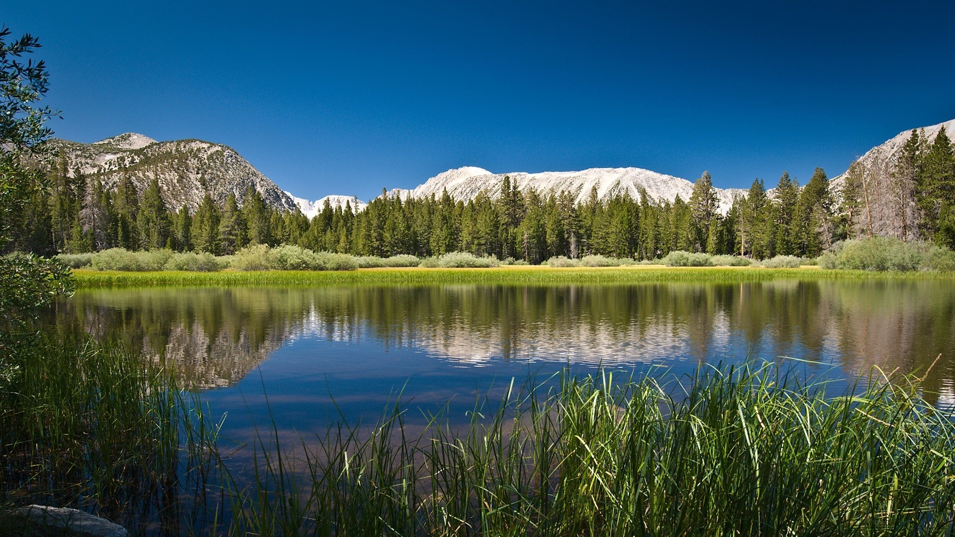 Vista delle montagne e della foresta attraverso il fiume con riflessione