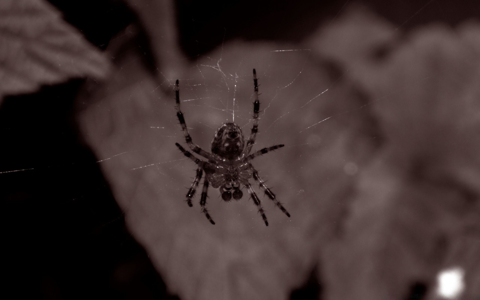Ragno su una ragnatela su uno sfondo di foglie grigie