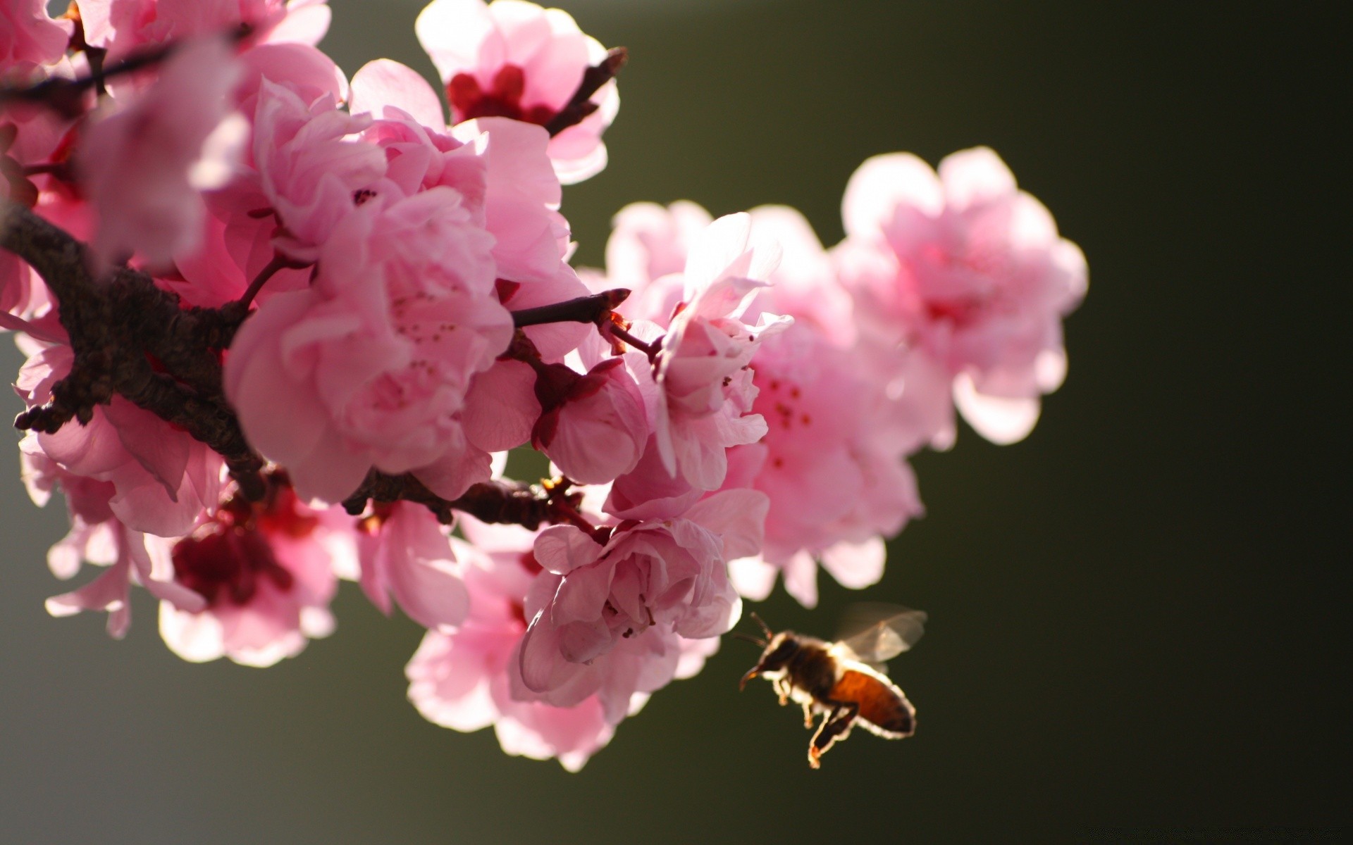 Un piccolo insetto volò verso un fiore di ciliegio luminoso
