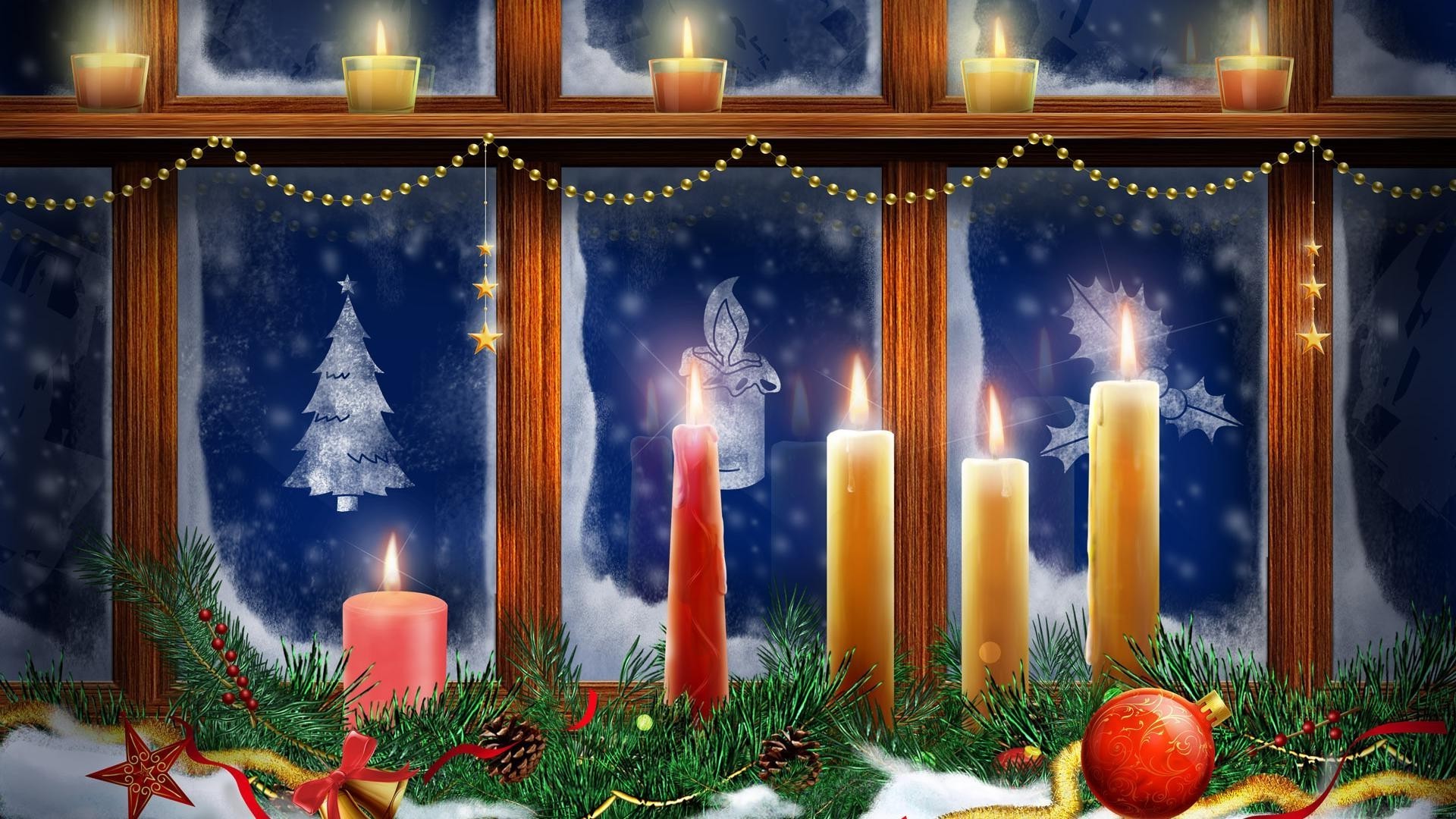 Disegno di Capodanno di candele accese vicino a una finestra congelata