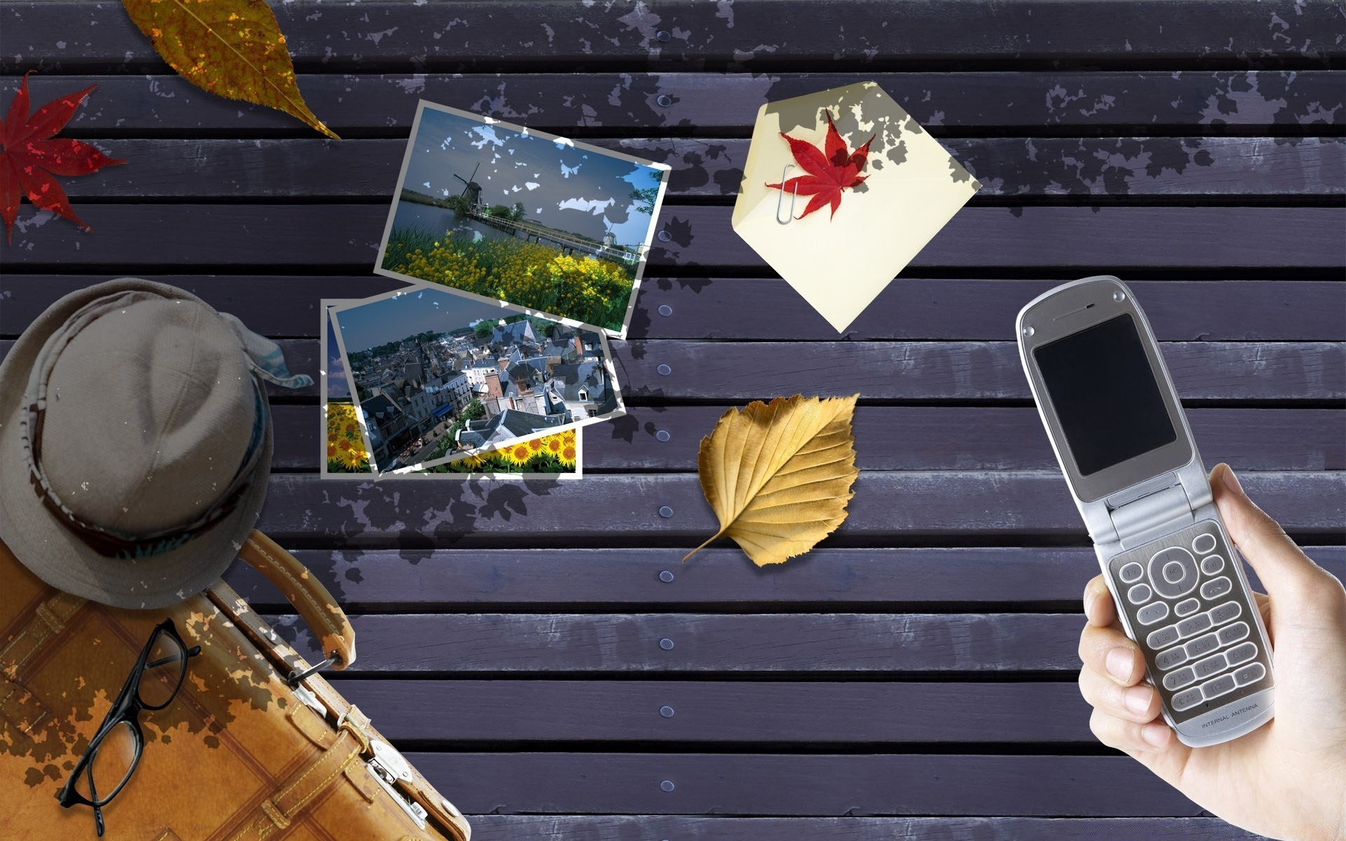 Sulla panchina ci sono foto e foglie che ricordano l'arrivo dell'autunno