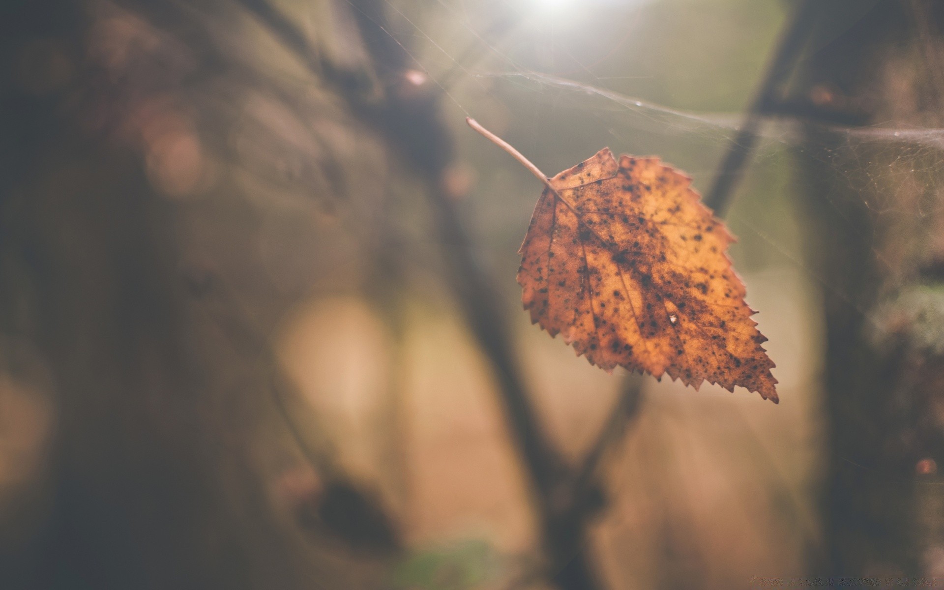 Fotografia macro di una foglia autunnale intrappolata in una ragnatelaFotografia macro di una foglia autunnale intrappolata in una ragnatela