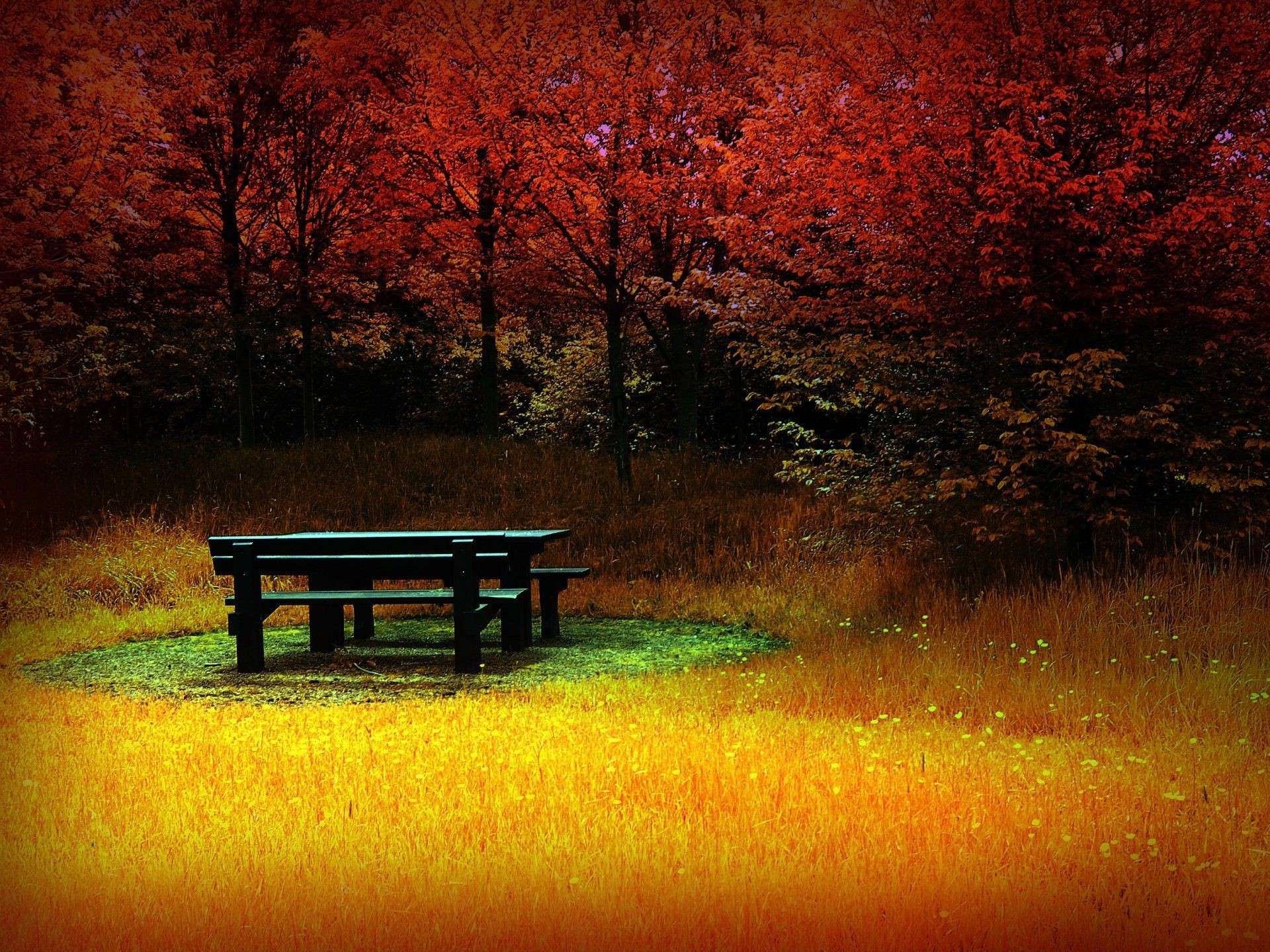 Panchina su un cerchio di erba estiva nel mezzo di una foresta autunnale