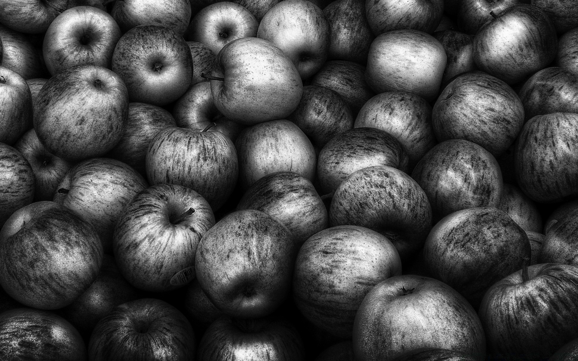 Natura morta, tristezza al volo. Raccolto di mele disegnato a colpo
