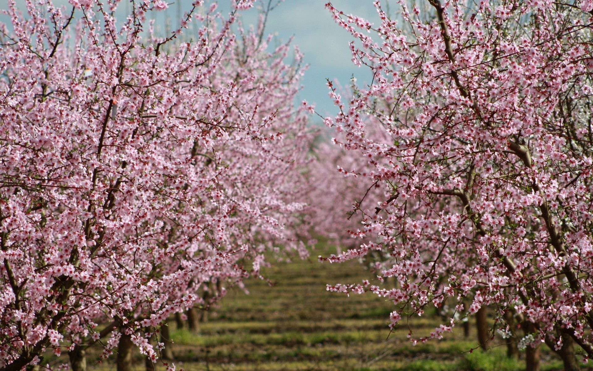 Servizio fotografico vicino all'acqua, tra gli alberi in fiore