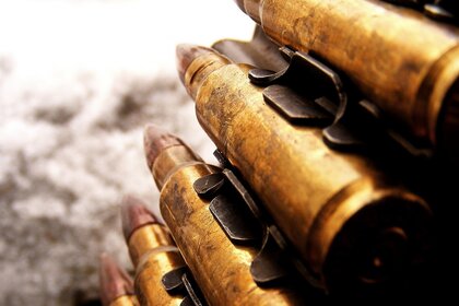 Un soldato con un fucile d'assalto in un elmetto giaceUn soldato con un fucile d'assalto in un elmetto giace