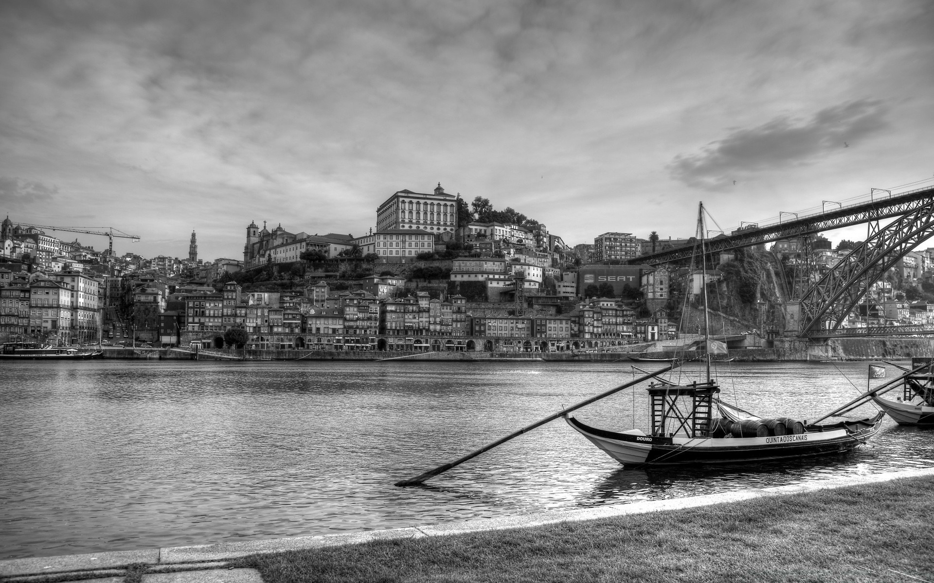 Bianco e nero paesaggio città vicino all'acqua