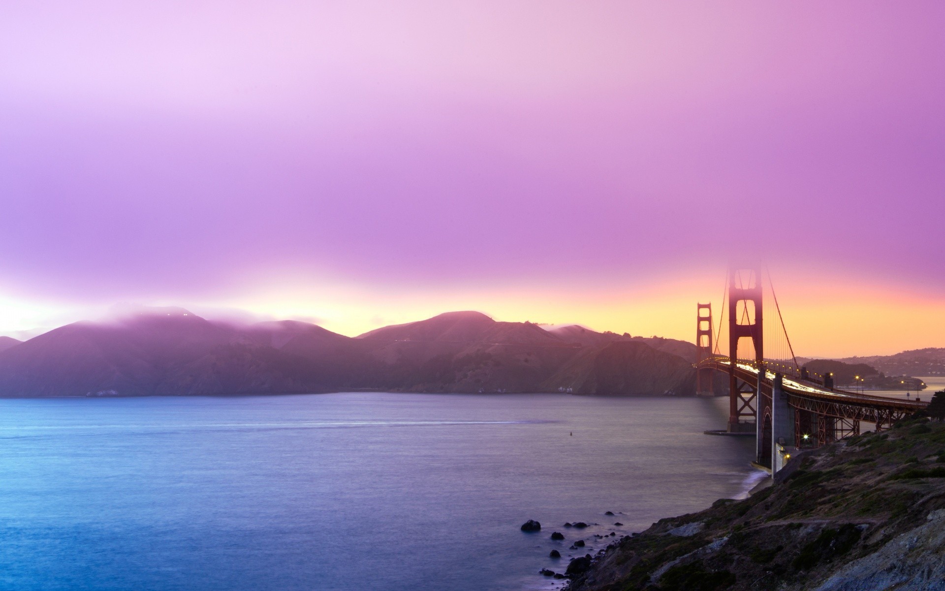 Bellissimo tramonto con vista sull'acqua e sul ponte