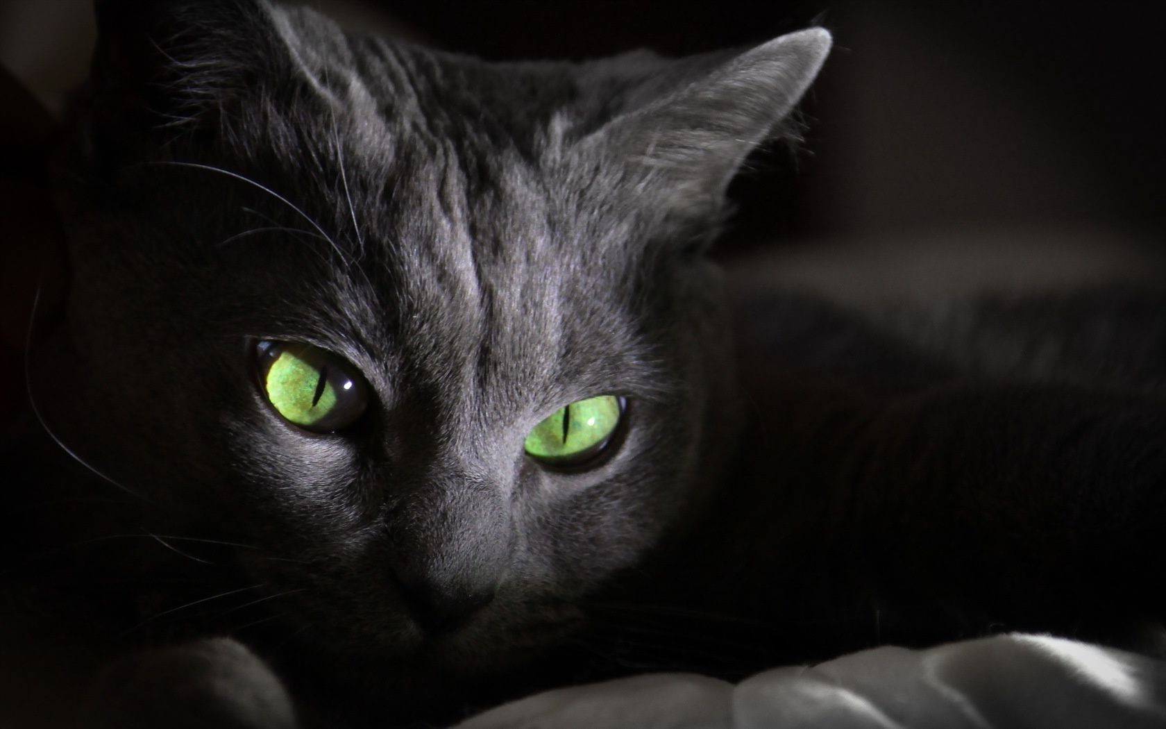 Ritratto di un gatto grigio con gli occhi verdi
