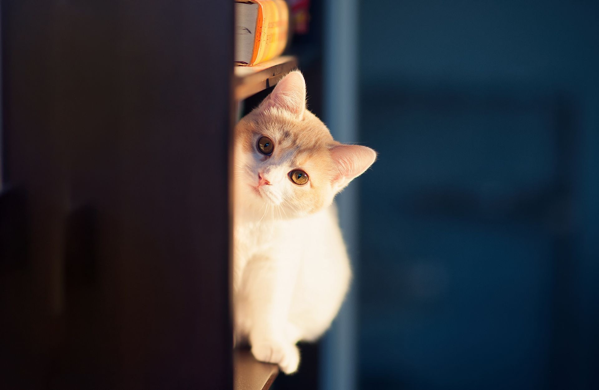 Un simpatico gattino si arrampicò su un supporto di pelliccia. Il gattino guarda dall'alto verso il basso