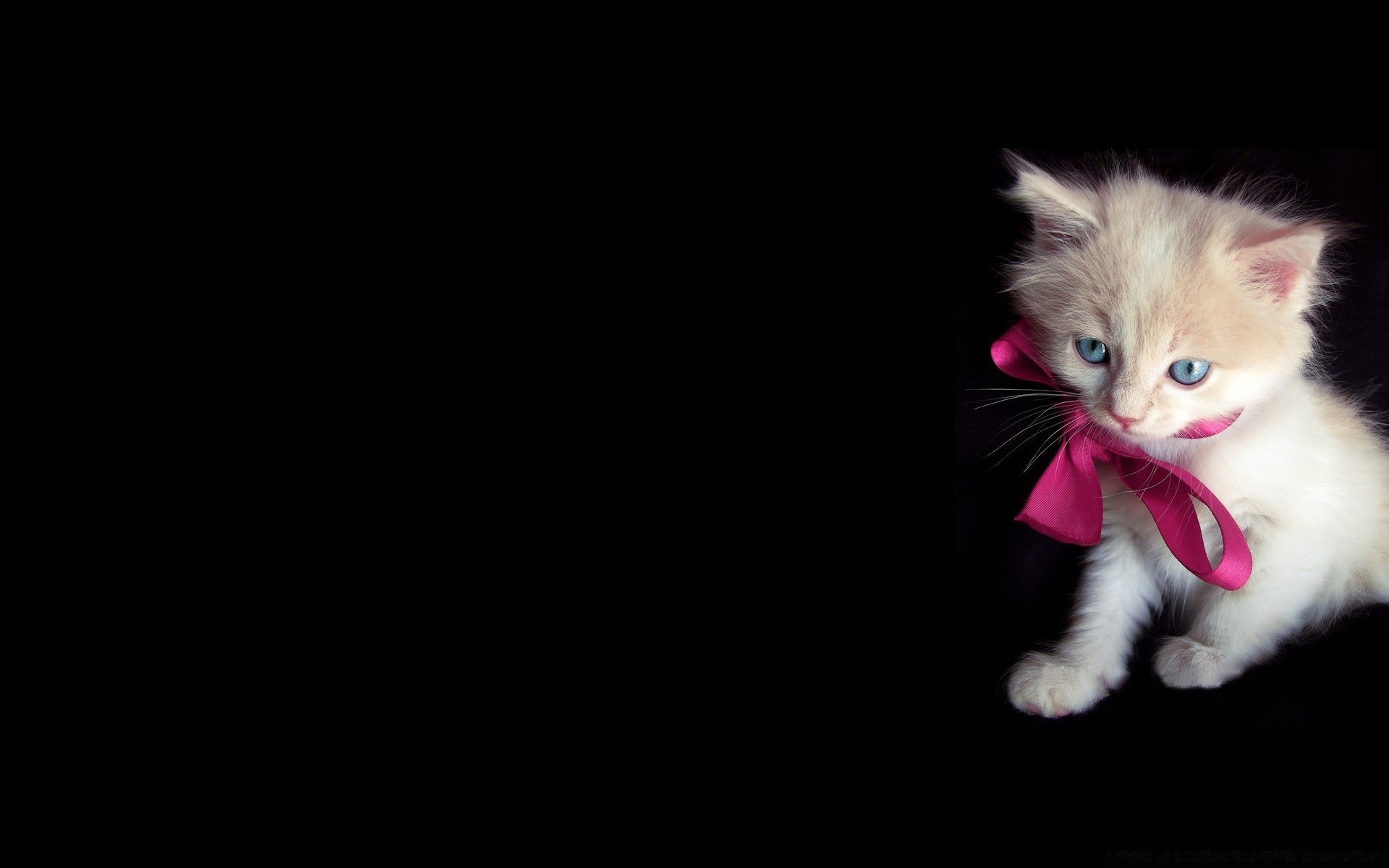 Gattino con gli occhi azzurri e fiocco rosa su sfondo nero