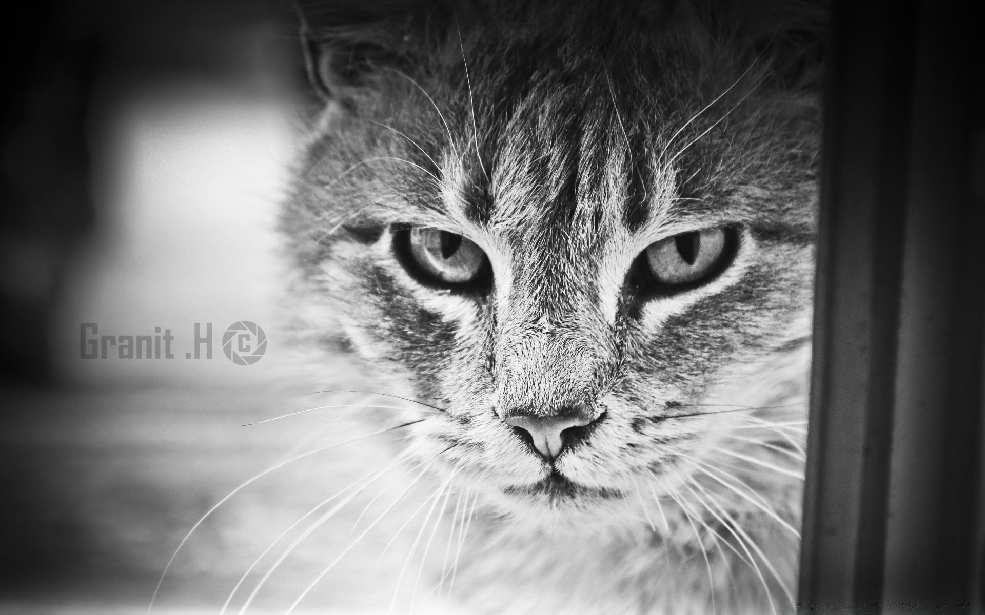 Pelliccia coperto di cenere-dark-hued gatto si trova e osserva