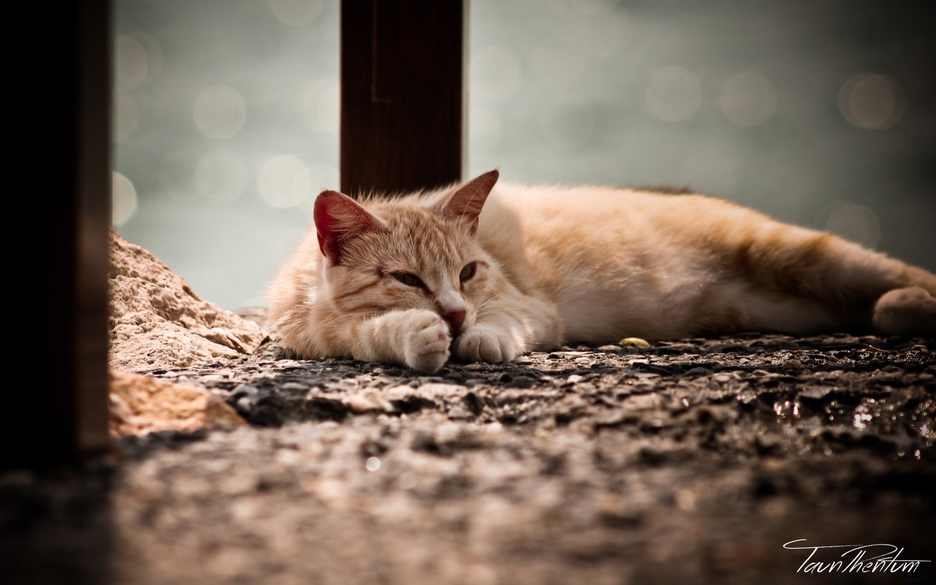 Gatto di strada seduto sul tappeto