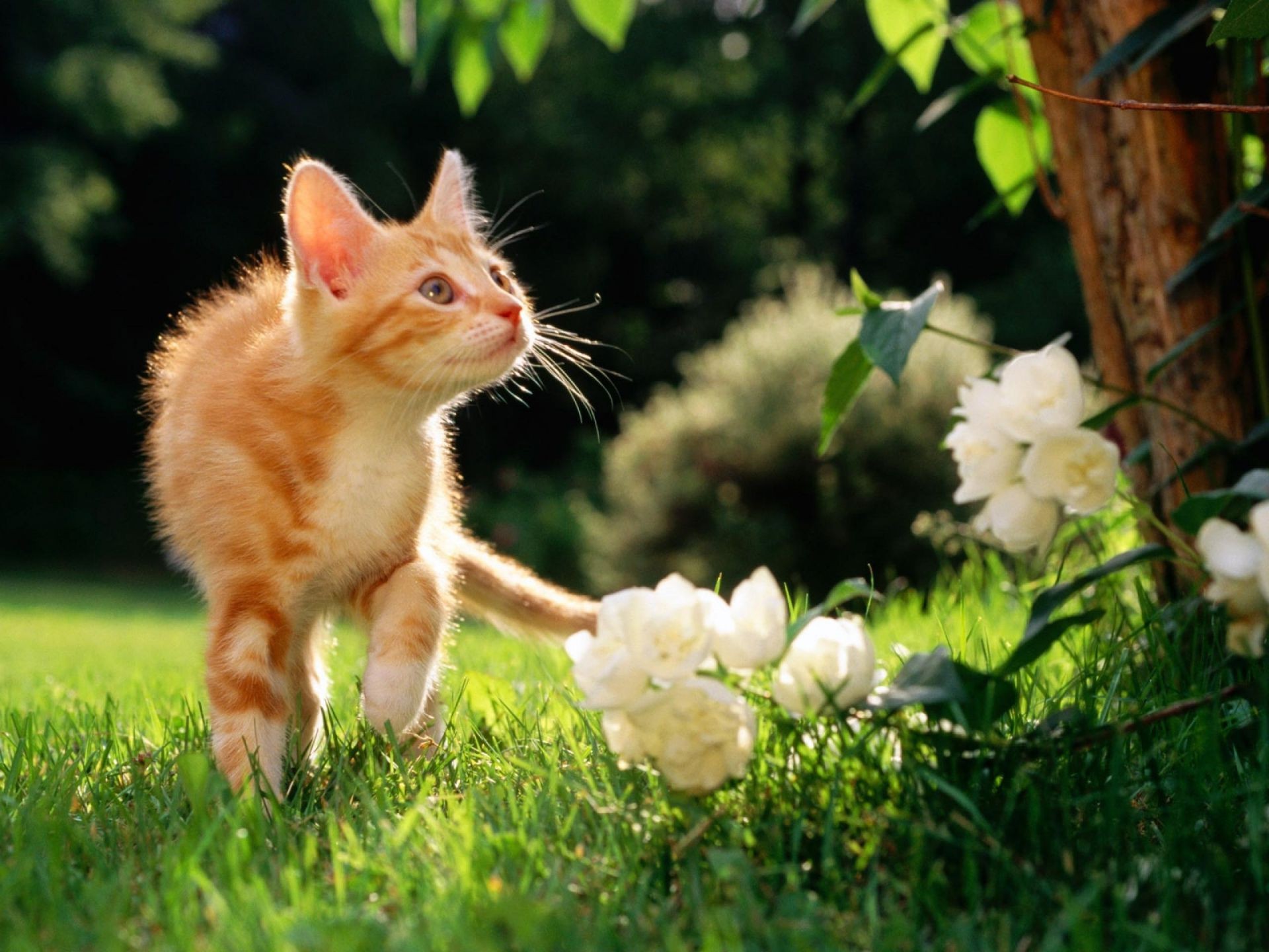 Gattino carino rosso sull'erba che guarda i fiori