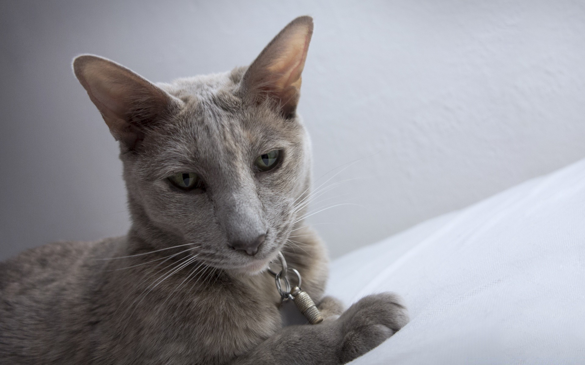 Un gatto purosangue giace su una coperta bianca