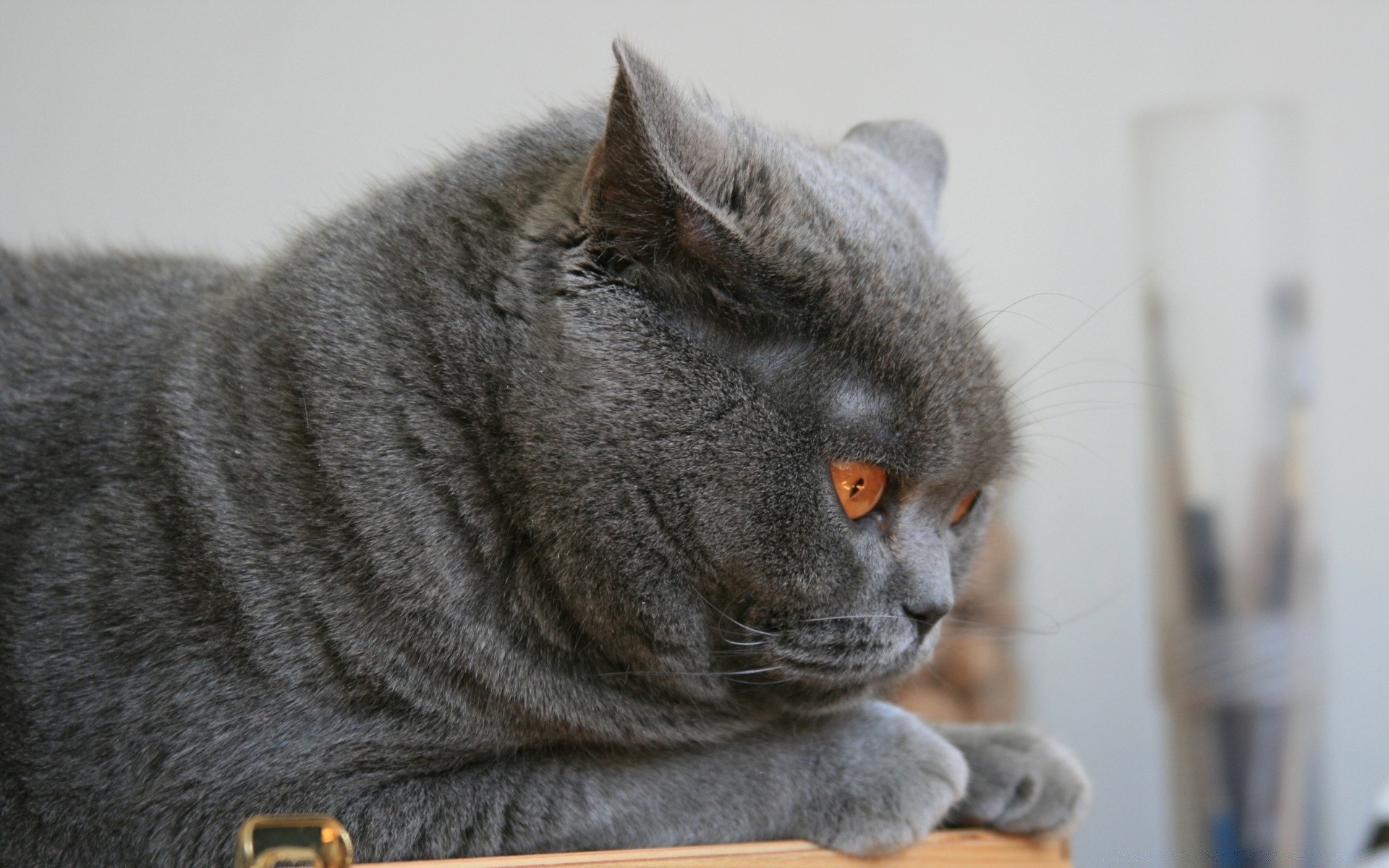 Pelliccia coperto di cenere-dark-hued gatto si trova e osserva