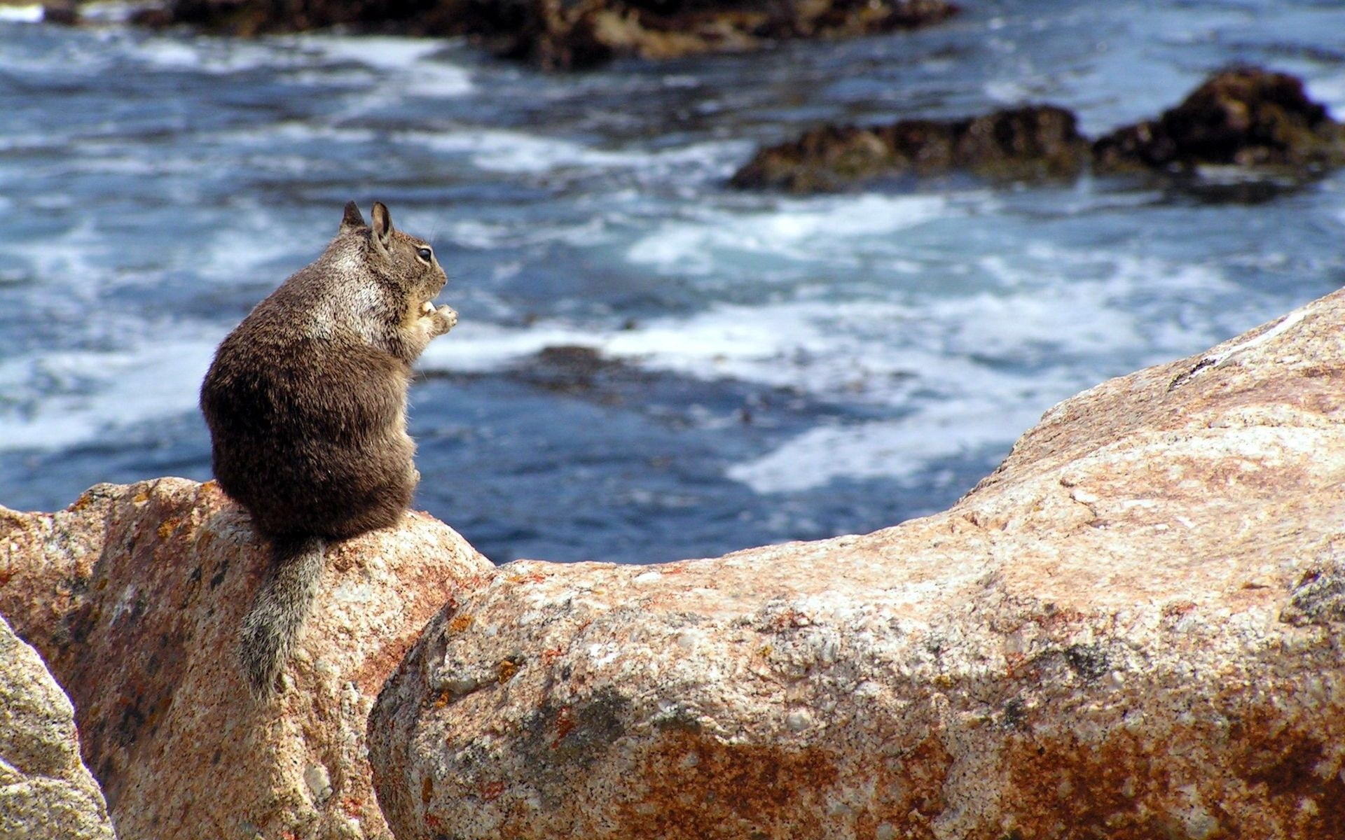 Solitario seduto su un masso in riva al mare criceto selvatico