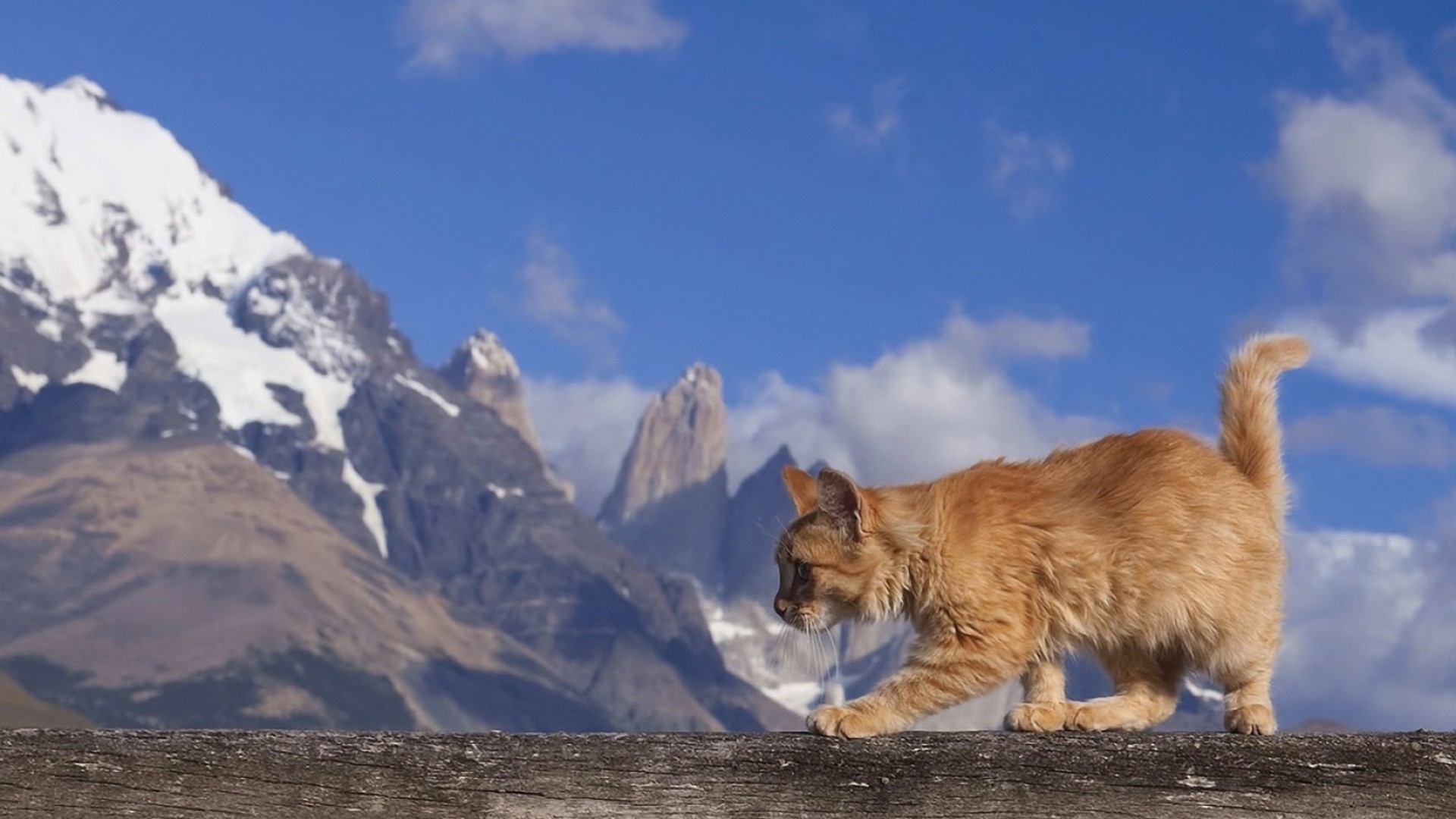 Figura di gatto rosso leggermente sorridente in piedi su una panchina