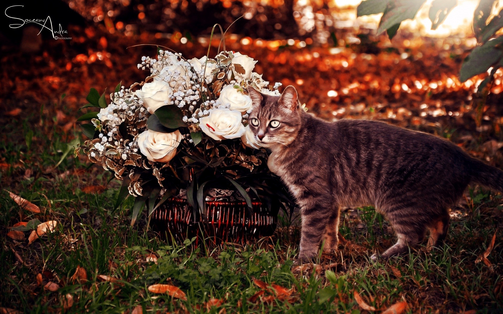 Gatto soriano grigio accanto a un cesto di rose biancheGatto soriano grigio accanto a un cesto di rose bianche