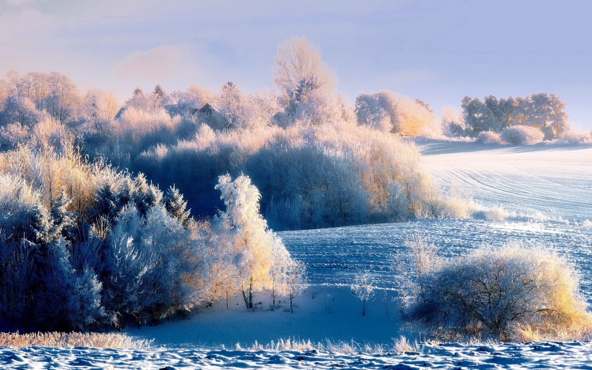 Alberi innevati sulle colline invernali