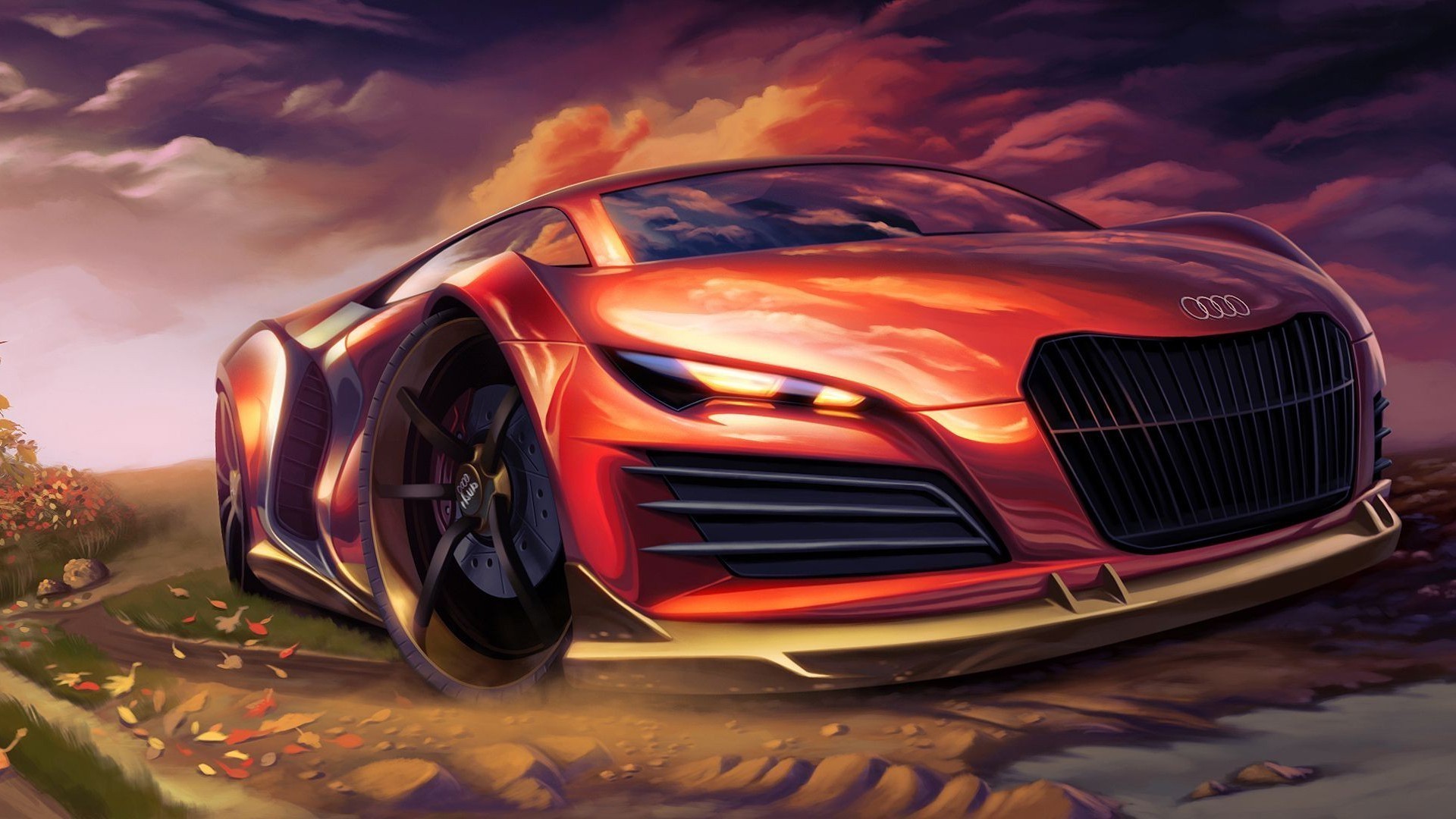 Auto sportiva rossa sulla strada asfaltata accanto al prato verde