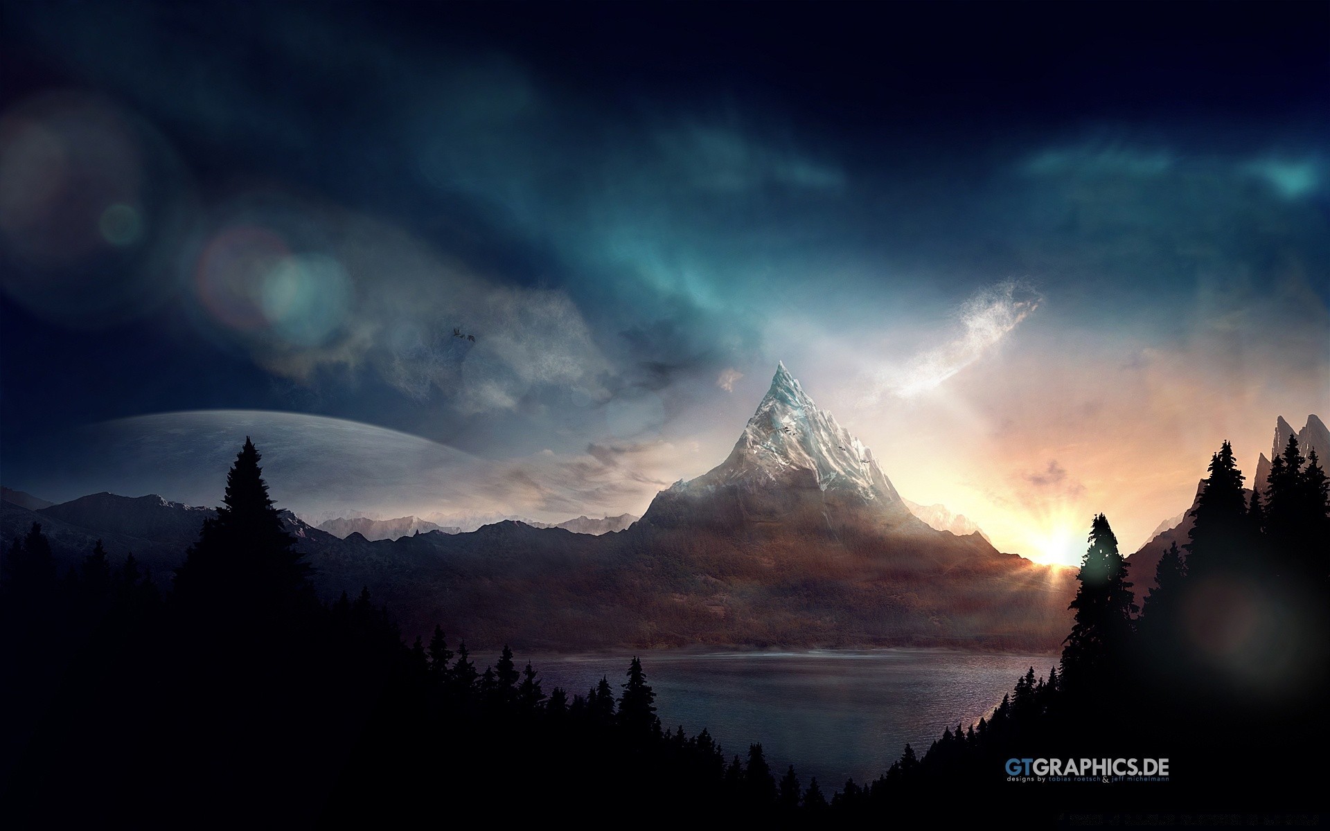 Fantasia. Alba. Montagna. Sfera nel cielo