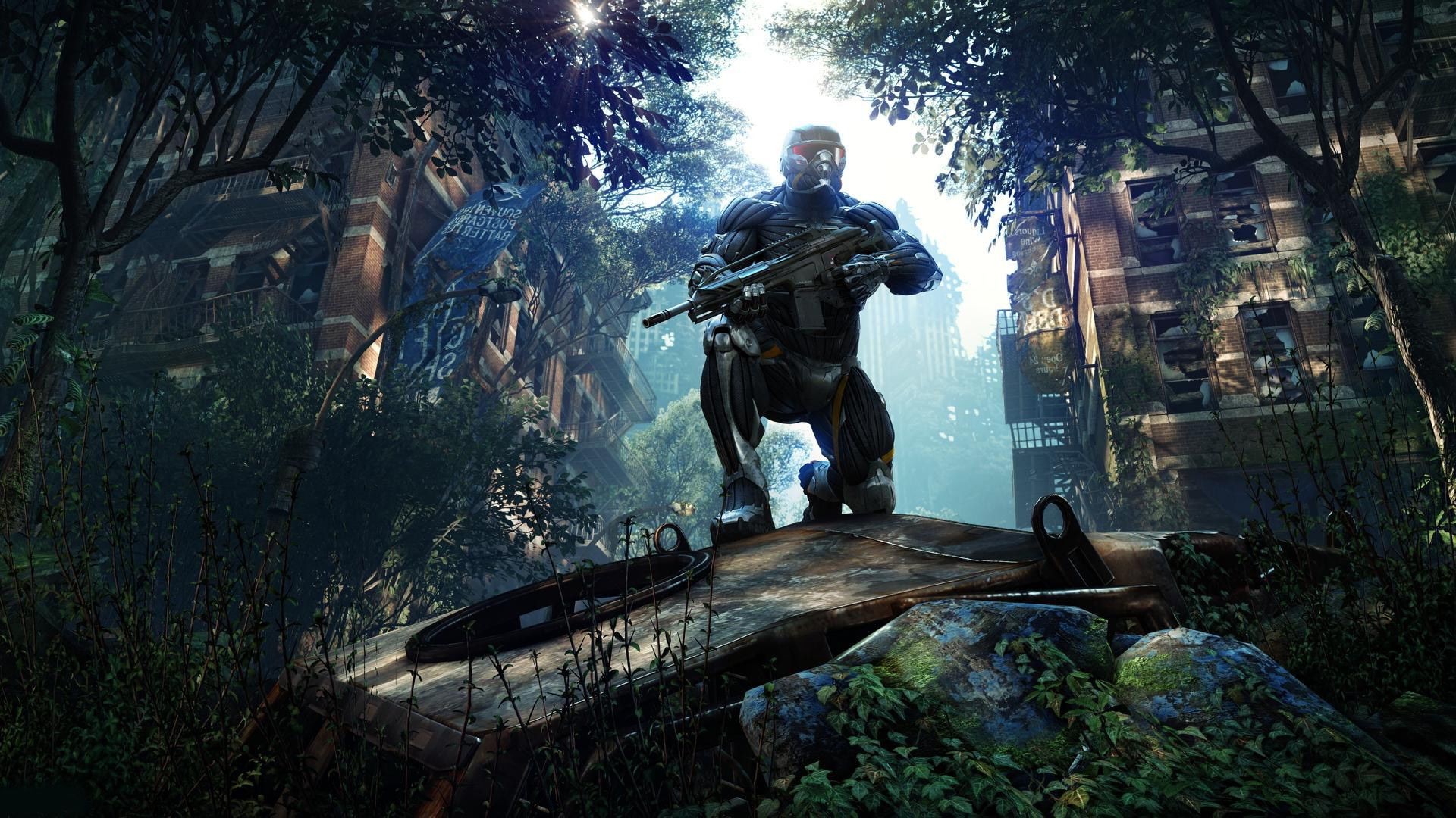 Uomo in munizioni con armi sullo sfondo di una città in rovina
