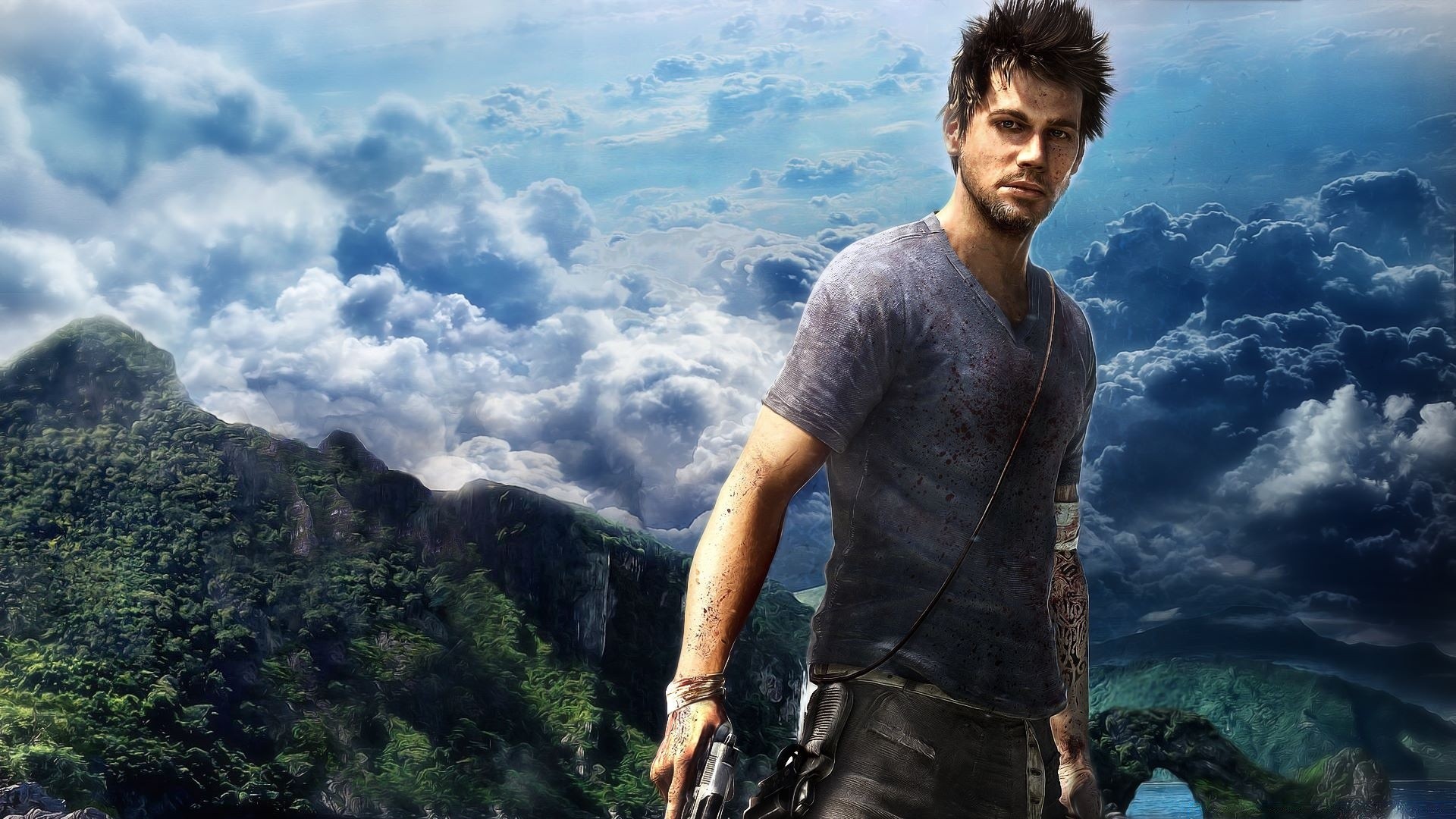 Eroe del gioco farcry, armato, in piedi sullo sfondo di un paesaggio montanoEroe del gioco Farcry, armato, in piedi sullo sfondo di un paesaggio montano